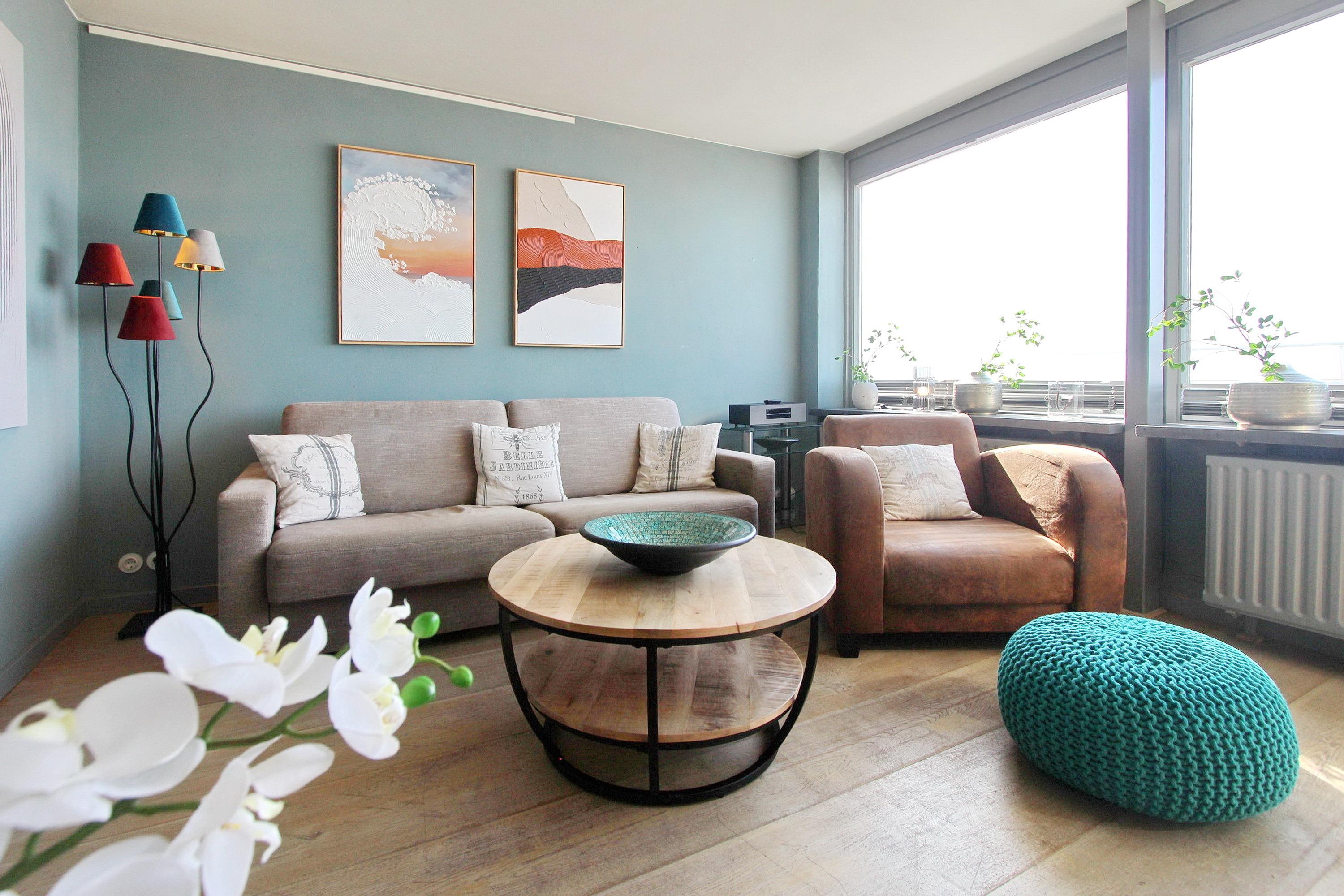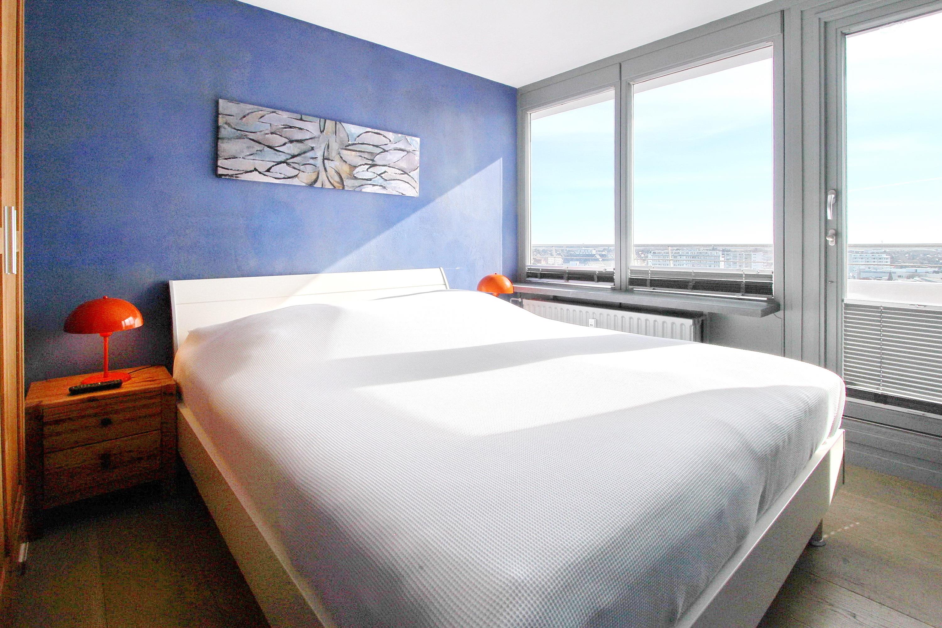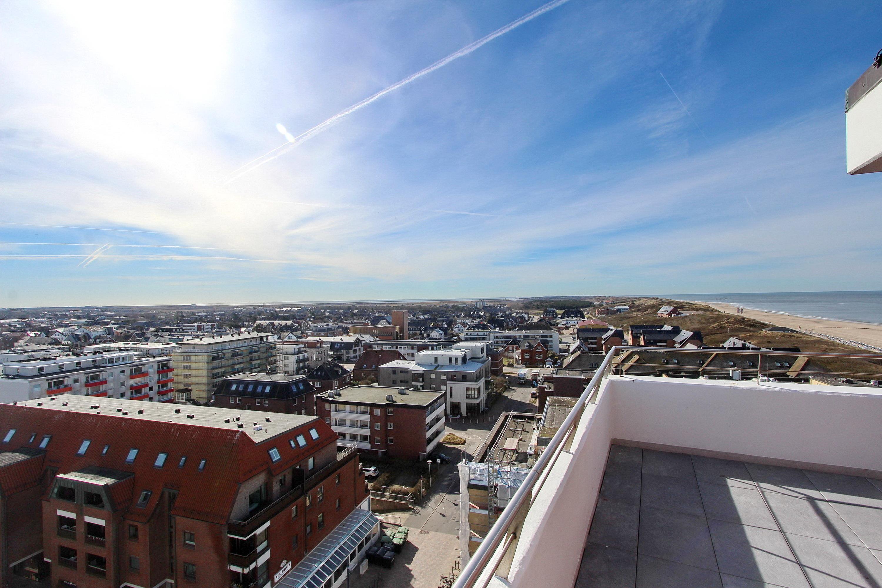 Penthouse-Wohnung in der 8. Etage des Haus am Meer mit herrlichem Weitblick über Sylt, auf den Strand und das Meer. Individuell eingerichteter Wohnraum mit großer Süd-/Ost Dachterrasse und Balkonmöbeln. Essplatz mit 4 Stühlen (unter anderem mit zwei Panton Chairs), bequeme Couch und Fernsehsessel. Das größere Schlafzimmer verfügt über ein Doppelbett, einen Kleiderschrank und einen zusätzlichen Flachbildfernseher. Das kleinere Schlafzimmer hat ein Einzelbett, einen Kleiderschrank und auch einen Flachbildfernseher. Das Tageslichtbadezimmer ist im Betondesign gehalten und hat eine Dusche, ein Bidet und einen Fön. In der offenen Küche mit Backofen, Induktionsherd und Geschirrspüler können sie sich selbst verpflegen. Eine Waschmaschine, Wäschespinne, ein Bügeleisen und Bügelbrett sind ebenfalls vorhanden. In der Wohnung wurde Holzfußboden verlegt. Zur technischen Ausstattung dieser Wohnung gehören: 3 Flachbildfernseher, eine Panasonic Micro Hifi Anlage mit CD Player und ein DVD Player. Kostenfrei können sie den WLAN HOT Spot (WEG Haus am Meer - Passwortfrei - ohne Gewähr) nutzen. Das Penthouse ist nur über eine Treppe erreichbar. Der Aufzug geht bis zur 7. Etage. Wohnungsgröße: ca. 60 m².