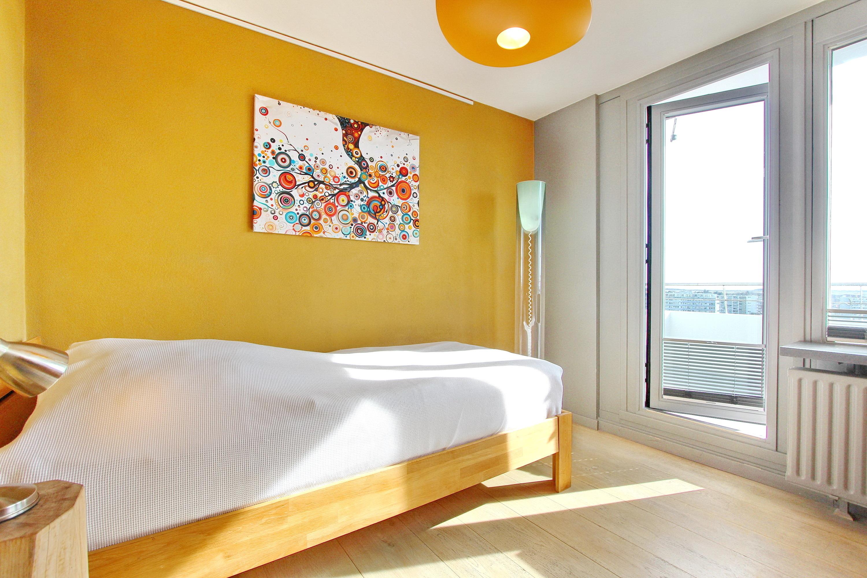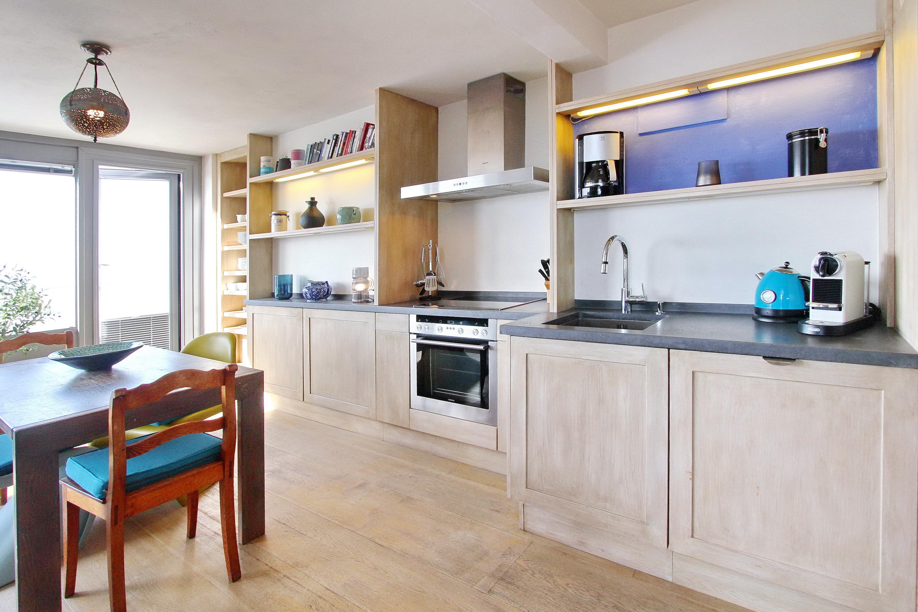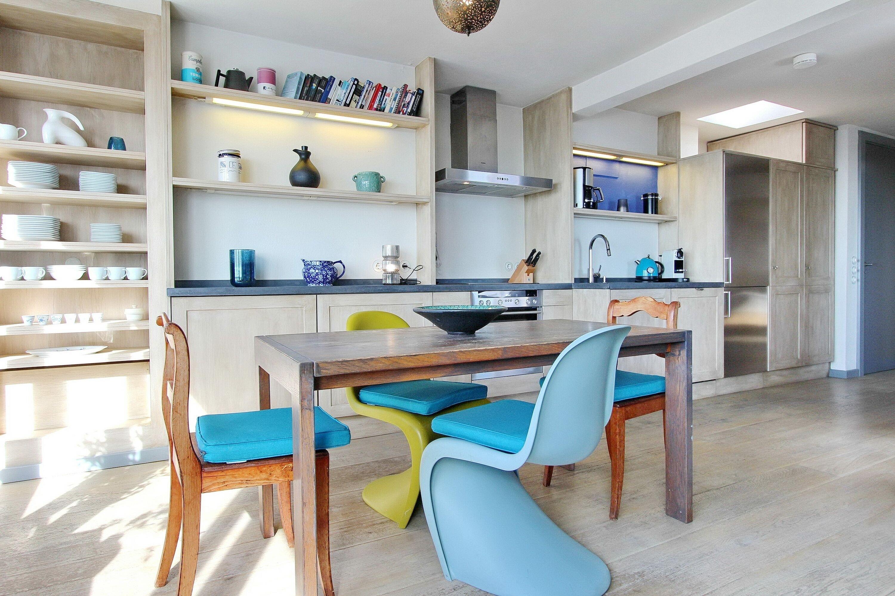 Penthouse-Wohnung in der 8. Etage des Haus am Meer mit herrlichem Weitblick über Sylt, auf den Strand und das Meer. Individuell eingerichteter Wohnraum mit großer Süd-/Ost Dachterrasse und Balkonmöbeln. Essplatz mit 4 Stühlen (unter anderem mit zwei Panton Chairs), bequeme Couch und Fernsehsessel. Das größere Schlafzimmer verfügt über ein Doppelbett, einen Kleiderschrank und einen zusätzlichen Flachbildfernseher. Das kleinere Schlafzimmer hat ein Einzelbett, einen Kleiderschrank und auch einen Flachbildfernseher. Das Tageslichtbadezimmer ist im Betondesign gehalten und hat eine Dusche, ein Bidet und einen Fön. In der offenen Küche mit Backofen, Induktionsherd und Geschirrspüler können sie sich selbst verpflegen. Eine Waschmaschine, Wäschespinne, ein Bügeleisen und Bügelbrett sind ebenfalls vorhanden. In der Wohnung wurde Holzfußboden verlegt. Zur technischen Ausstattung dieser Wohnung gehören: 3 Flachbildfernseher, eine Panasonic Micro Hifi Anlage mit CD Player und ein DVD Player. Kostenfrei können sie den WLAN HOT Spot (WEG Haus am Meer - Passwortfrei - ohne Gewähr) nutzen. Das Penthouse ist nur über eine Treppe erreichbar. Der Aufzug geht bis zur 7. Etage. Wohnungsgröße: ca. 60 m².