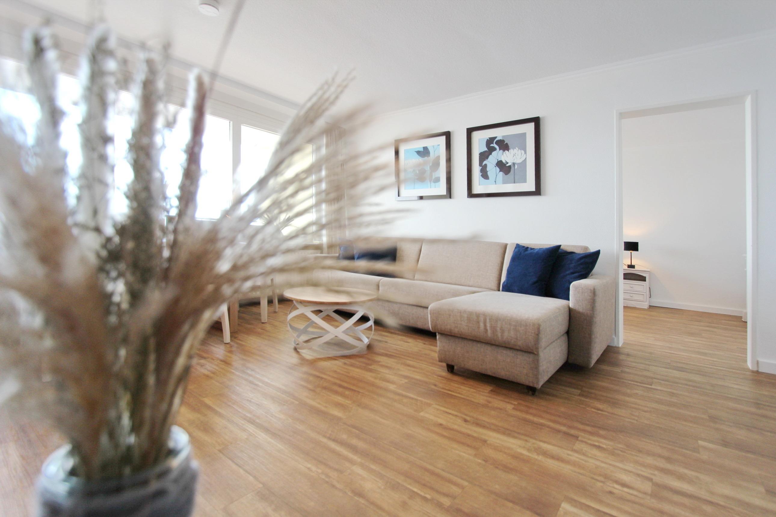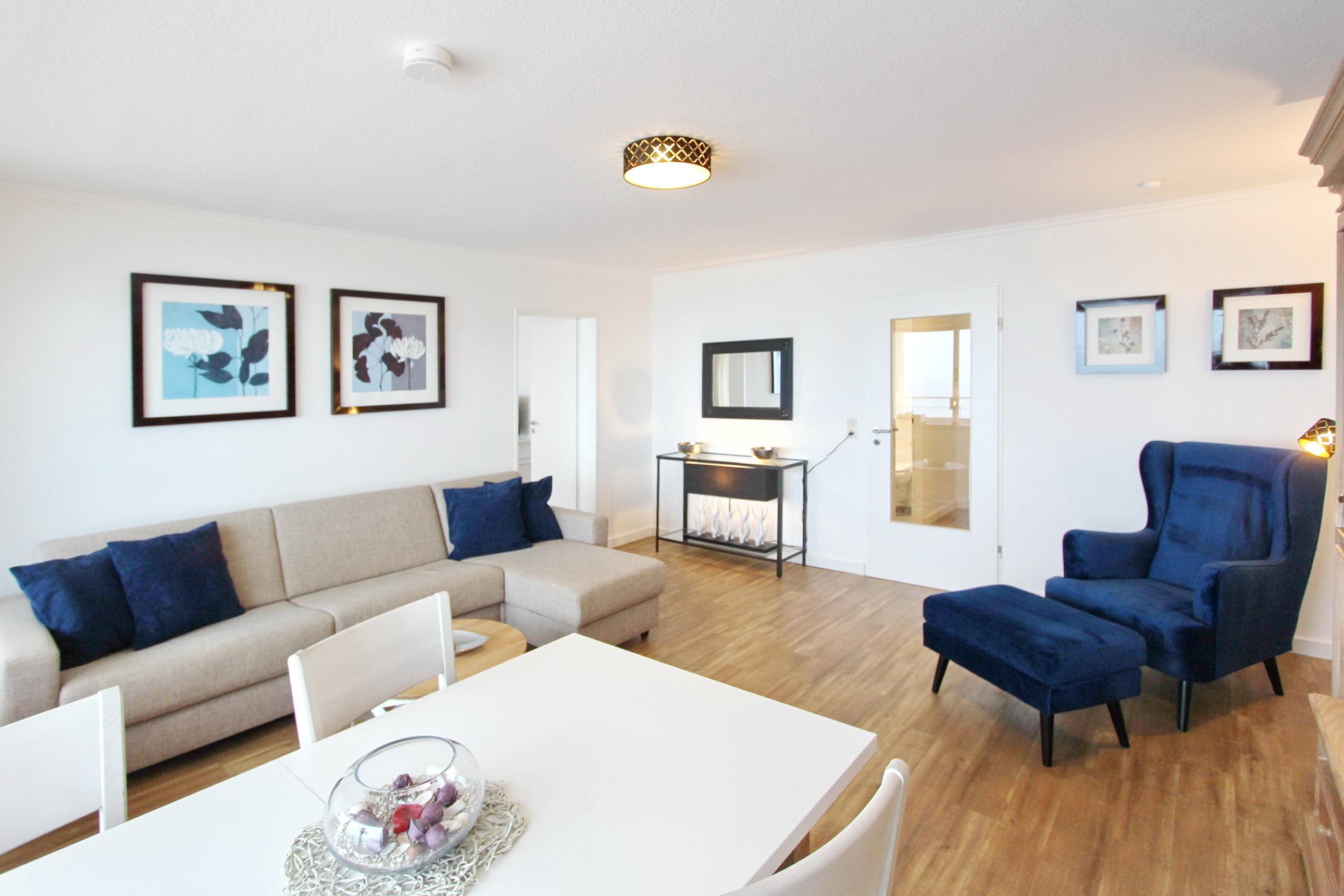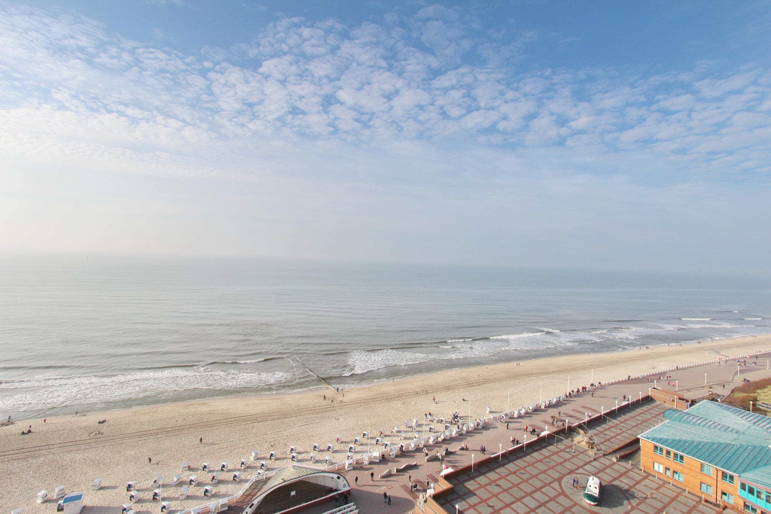 Große Zweizimmerwohnung in der 12. Etage im Haus Metropol mit herrlichem Blick über den Strand und das Meer. Das Wohnzimmer und das Schlafzimmer haben je einen vorgelagerten Westbalkon mit Loungemöbeln. Ausgestattet ist die Wohnung mit einer Couch mit Schlaffunktion, 1 gemütlichen Ohrensessel mit Hocker, einem Essplatz mit 4 Stühlen und einer Schrankwand mit viel Stauraum. Designboden in Holzoptik verleiht dem Raum Wärme und Gemütlichkeit. Im Schlafzimmer gibt es ein feststehendes Doppelbett mit 2 Matratzen und ein TV. Im separaten Ankleidezimmer gibt es einen großen Kleiderschrank, Sessel und Spiegel. Um sich selbst zu verpflegen verfügt diese Wohnung über eine kleine Küche mit Geschirrspüler, Backofen, Ceranfeld und Mikrowelle. Stilvoll decken Sie den Tisch mit Geschirr von Thomas Trend. Das Badezimmer hat eine Dusche, die einen niedrigen Einstieg hat, einen Fön und einen Handtuchtrockner. Zur technischen Ausstattung gehört: ein Flachbildfernseher von Panasonic und ein Radio. Ein freies WLAN Netzwerk (WEG Haus Metropol - Passwortfrei - ohne Gewähr) steht ihnen kostenfrei zur Verfügung. Wohnungsgröße: ca. 67 m².