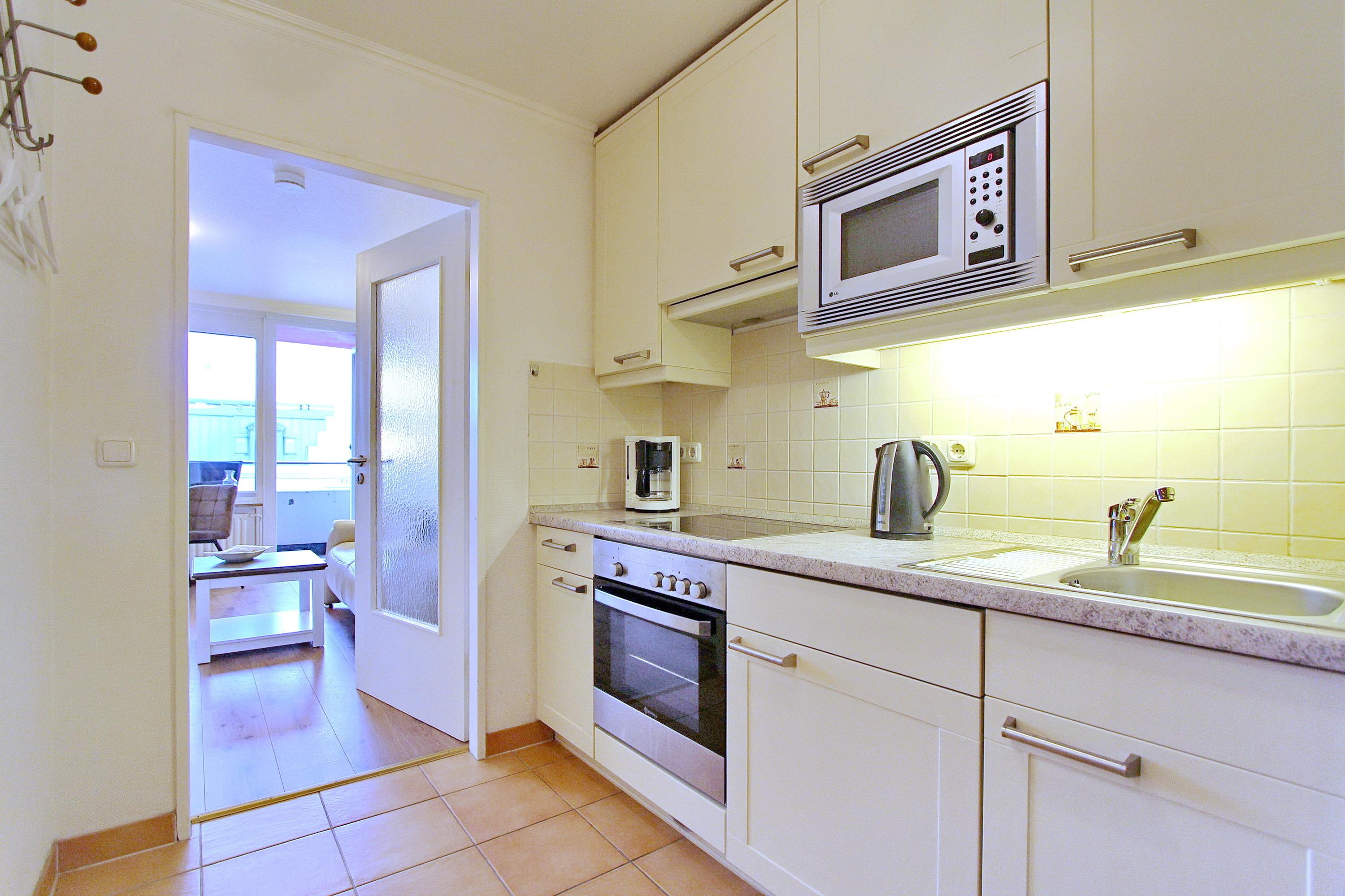 Hell und freundlich eingerichtete Einzimmerwohnung in der 2. Etage im Haus am Meer zur Landseite. Wenige Schritte trennen Sie vom Strand und dem Meer. Der kombinierte Wohn-Schlafraum ist ausgestattet mit einem Doppelschrankbett, einem Essplatz am Fenster mit 2 Stühlen, sowie einer Kunstledercouch. In der Wohnung wurde Laminatboden verlegt und auf Teppiche komplett verzichtet. In der Schrankwand gibt es einen großen Kleiderschrank mit ausreichend Stauraum für Ihre persönlichen Dinge. Vom Balkon aus können Sie das Treiben auf der Friedrichstraße beobachten. Balkonmöbel mit Auflagen sind vorhanden. Das Badezimmer hat eine Dusche, einen Fön und einen Handtuchtrockner. In der Küchenzeile im Flur mit Cerankochfeld (4 Herdplatten), Backofen und Mikrowelle können Sie sich selbst verpflegen. Zur technischen Ausstattung dieser Wohnung gehört: ein Flachbildfernseher und ein Radio mit CD Spieler. Ein kostenfreier WLAN Zugang (WEG Haus am Meer - Passwortfrei - ohne Gewähr) ist vorhanden. Wohnungsgröße: ca. 30 m².