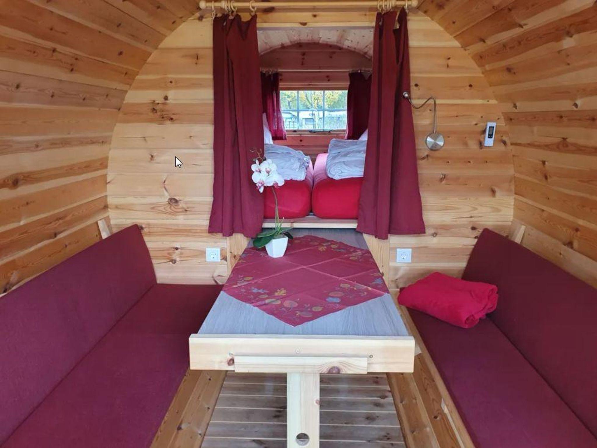 Camping-Schaffass für bis zu 4 Personen. Es können die Sanitäranlagen vom Campingplatz genutzt werden.