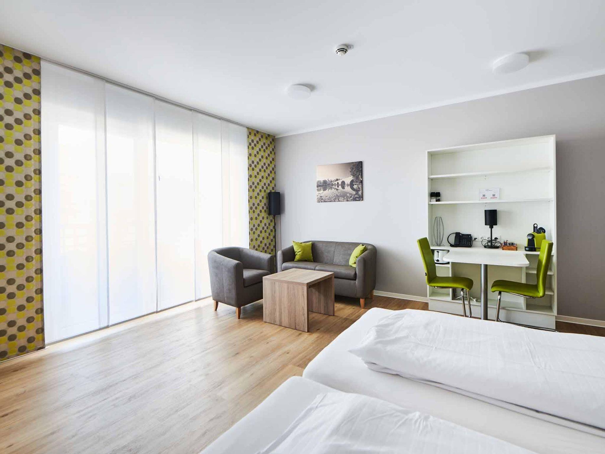 Unsere drei großzügig geschnittenen Einzel- und Doppel-Apartments der Größe M mit 45 qm vereinen stilvolles Design mit durchdachtem Komfort – ideal für gehobenes Wohnen auf Zeit. Die großen Glasfronten und die private Terrasse lassen viel Tageslicht herein und schaffen ein offenes, einladendes Ambiente. Jedes Apartment bietet eine voll ausgestattete Küche, ein modernes Bad, reichlich Stauraum und eine hochwertige Ausstattung, die keine Wünsche offenlässt. Für zusätzlichen Komfort sorgen kostenfreie Waschmaschinen und Trockner im Gebäude, kostenloser Kaffee sowie schnelles WLAN – alles, was Sie für ein angenehmes und unabhängiges Wohnerlebnis benötigen.