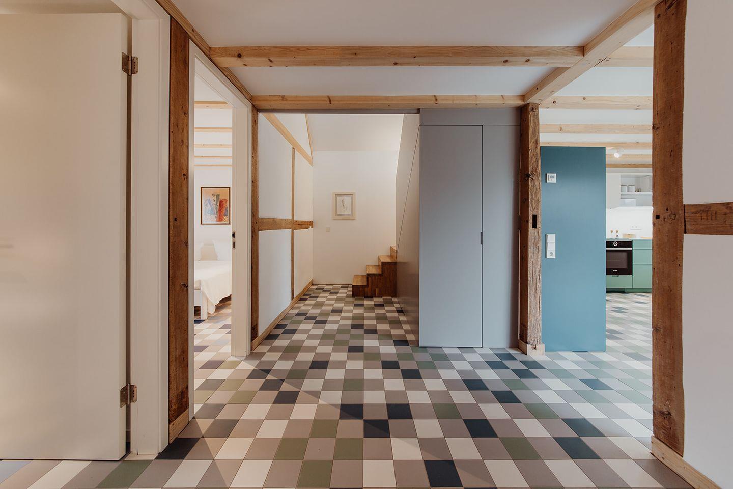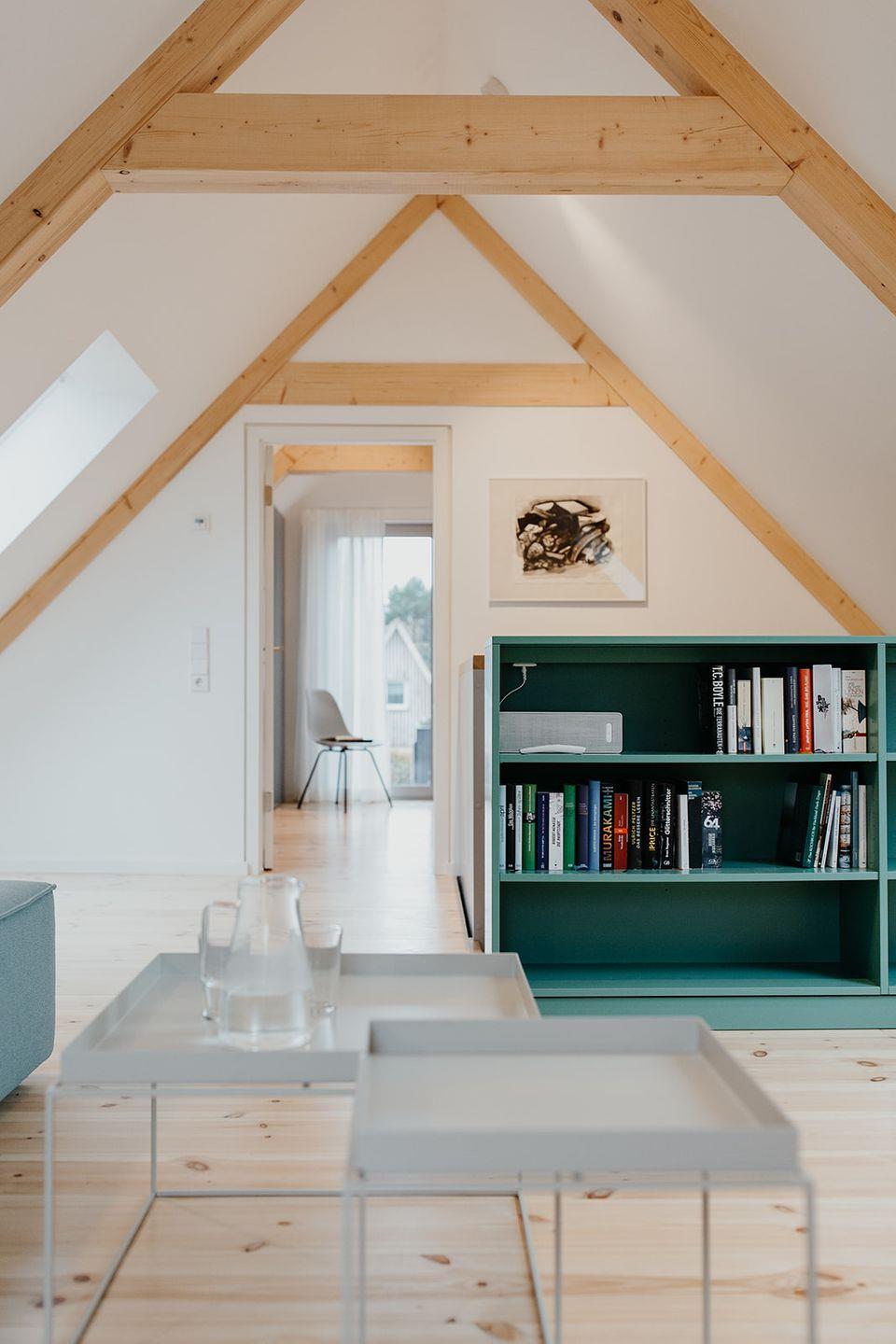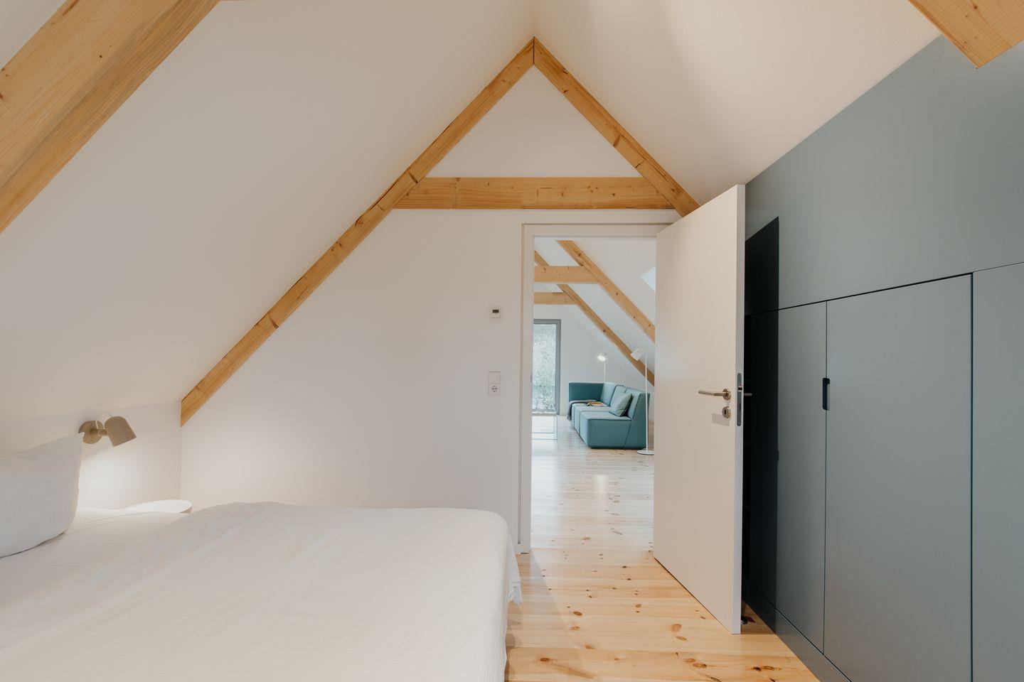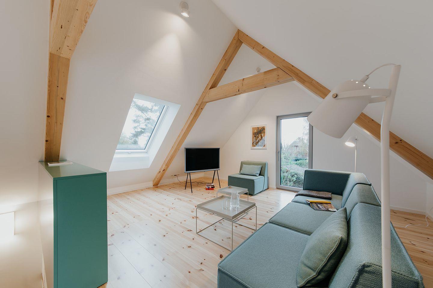 Über eine zentral gelegene Treppe gelangt man ins Obergeschoss, wo sich das Wohnzimmer und ein weiteres Schlafzimmer befinden. Die Raumaufteilung schafft sowohl gemeinschaftliche Bereiche als auch private Rückzugsorte und macht die Remise zu einem besonderen Ferienhaus auf Fischland-Darß-Zingst.