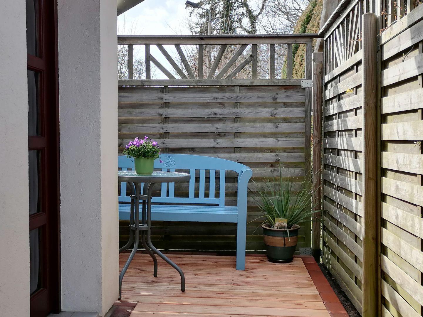 Am Ferienhaus laden Gartenmöbel zum Verweilen ein.