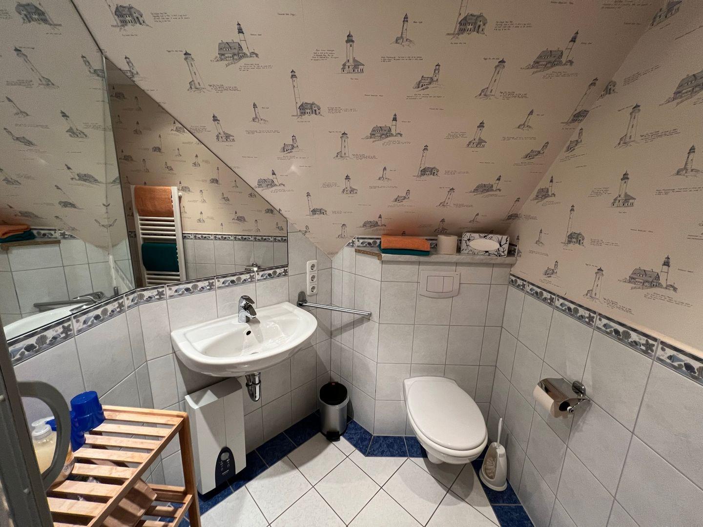 * Bad mit Waschbecken, großem Spiegel, Dusche/WC & einer Infrarot-Wärmelampe