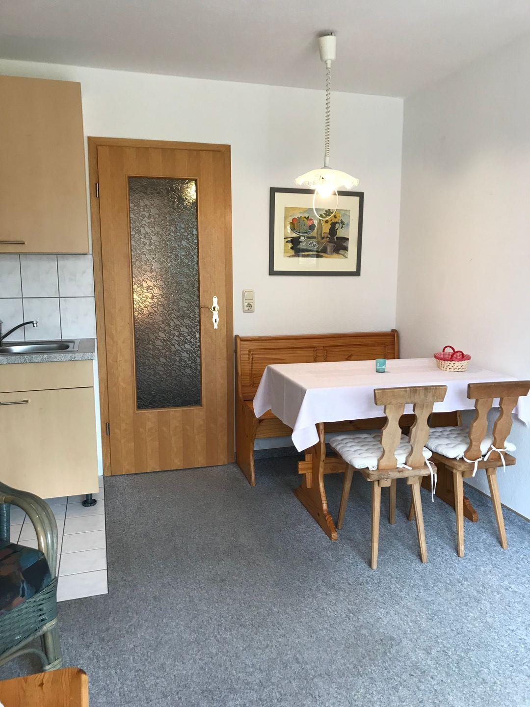Im Wohnbereich ist eine Küchenzeile und ein Eßplatz integriert .