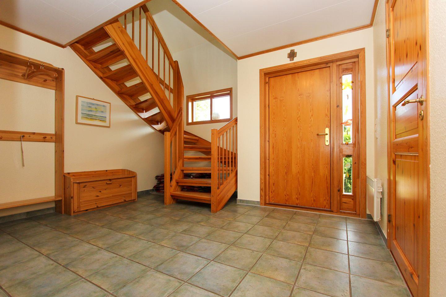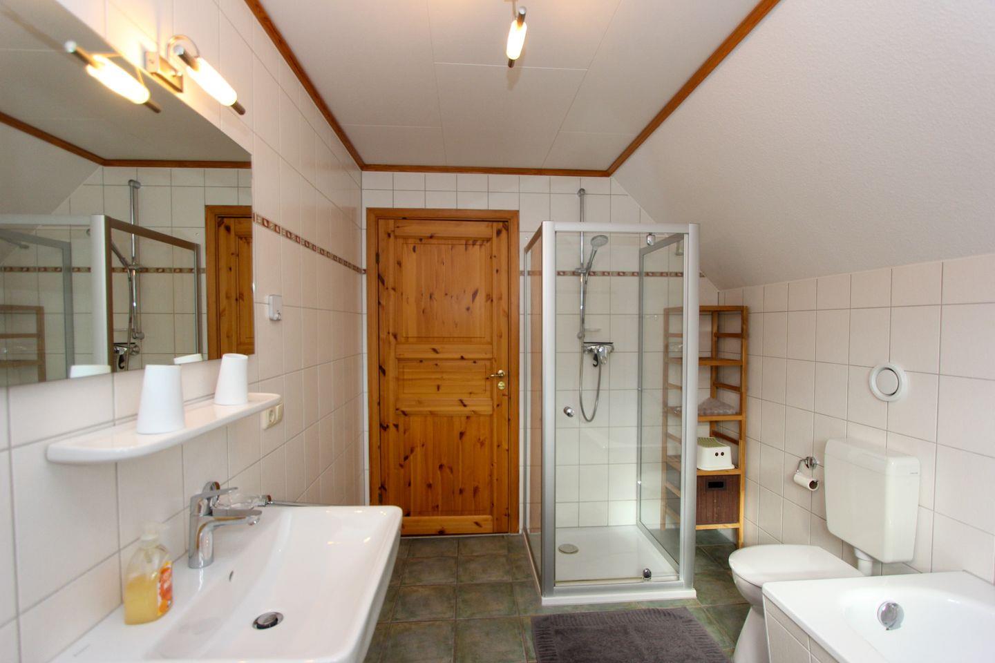 Das Haus verfügt über ein Badezimmer mit Dusche und Badewanne und einem zusätzlichem Gäste-WC. Der großzügige Wohnbereich wirkt einladend und gemütlich. Ein Kaminofen sorgt an kühleren Tagen für behagliche Wärme und wohnliche Atmosphäre. Die große Küche mit Essbereich eignet sich hervorragend für gemeinsame Mahlzeiten und lässt keine Wünsche offen: Herd, Backofen, Kühlschrank, Spülmaschine, Kaffeemaschine sowie Wasserkocher gehören zur Ausstattung. Für zusätzlichen Komfort bei längeren Aufenthalten sorgt die eigene Waschmaschine. Ein Wäscheständer ist ebenfalls vorhanden.