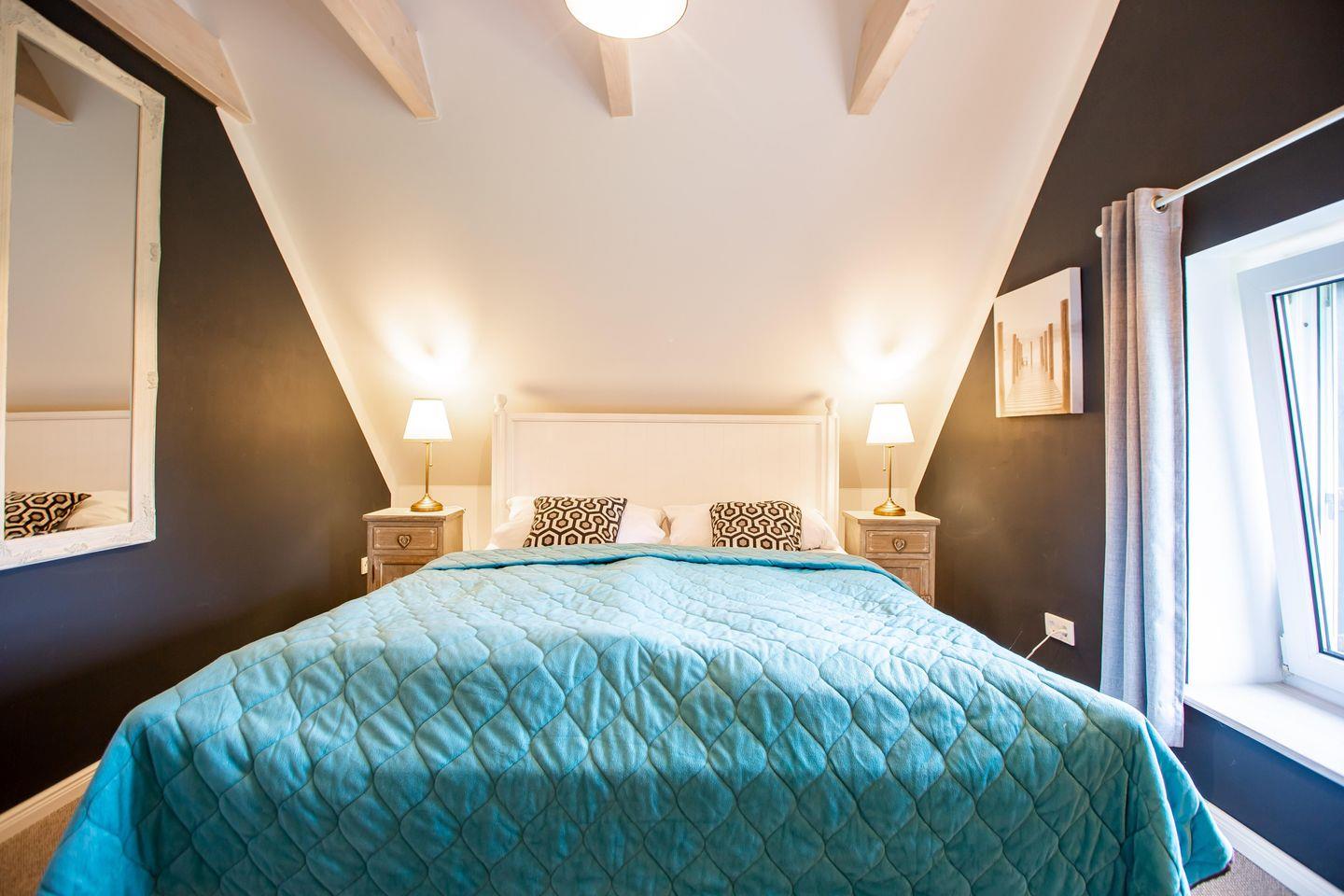 Im Obergeschoss erwarten dich zwei weitere Schlafzimmer mit Doppelbetten (160 cm und 140 cm), eines davon mit zusätzlichem TV. Ein helles Galeriezimmer mit Schreibtisch bietet dir zudem die Möglichkeit, auch im Urlaub entspannt zu arbeiten. Abgerundet wird diese Etage durch ein weiteres Badezimmer mit Dusche und WC.