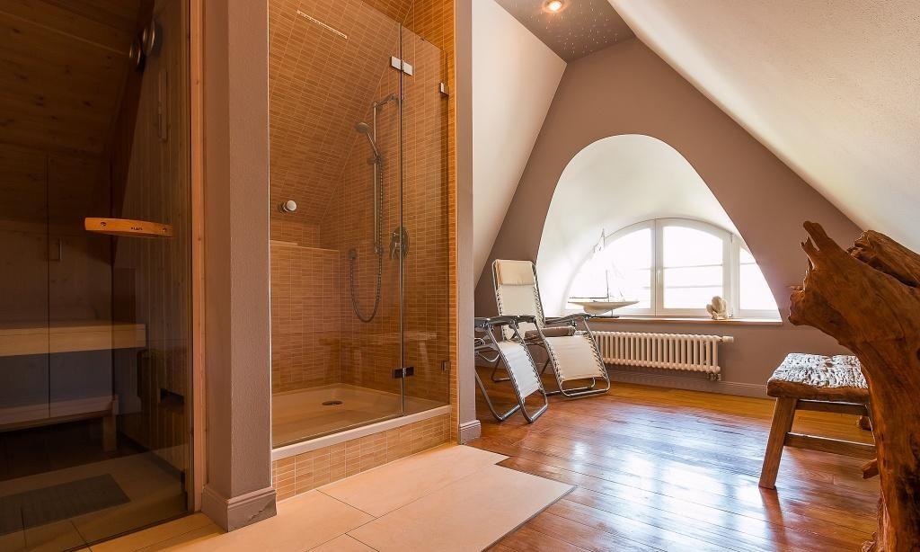 Im Erdgeschoss befindet sich der lichtdurchflutete Wohnraum, der mit einer gemütlichen Sitzecke und dem Kamin zum Mittelpunkt des Hauses gehört. Die komfortable und funktionale Küchenzeile sowie ein großzügiger Essbereich fügen sich harmonisch ein und schaffen eine offene Wohnatmosphäre. Ein Gästebad mit Dusche/WC schließt sich direkt an. Die große Holzterrasse mit Blick ins Grüne ist direkt vom Wohnbereich aus begehbar und lädt zum Verweilen ein. Im ersten Obergeschoss befinden sich drei Schlafzimmer, die jeweils mit Doppelbetten ausgestattet sind. Das hochwertige Bad verfügt über eine Badewanne/ WC. Das Dachgeschoss beherbergt einen Wellnessbereich mit Sauna und Dusche sowie einen Ruhebereich - ideal zum Entspannen, gerade an kühleren Tagen!