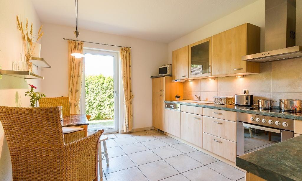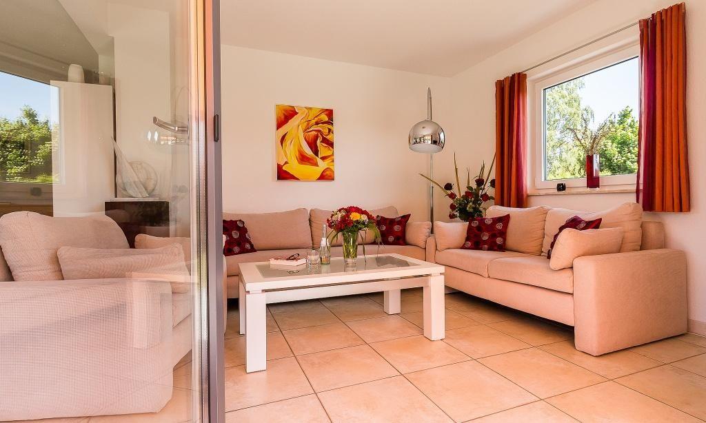 Im Erdgeschoss erwartet dich der helle und freundliche Wohnraum mit gemütlicher Wohnlandschaft und TV-Bereich sowie einem großzügigen Esstisch. Die Küche befindet sich separat und ist komfortabel ausgestattet. Auch ein Gäste-WC ist in der unteren Etage untergebracht. Das Obergeschoss verfügt über zwei Schlafzimmer. Eines ist mit einem Doppelbett und das weitere ebenfalls mit einem Doppelbett sowie einem zusätzliches Schlafsofa ausgestattet, welches als Aufbettungsmöglichkeit für ein Kind (4-13 Jahre) genutzt werden kann. Ein großes Bad mit Wanne und Dusche/WC befindet sich ebenfalls auf der Etage. Die komfortable Ausstattung und lichtdurchflutete Räume sorgen im gesamten Ferienhaus für eine angenehme Wohnatmosphäre.