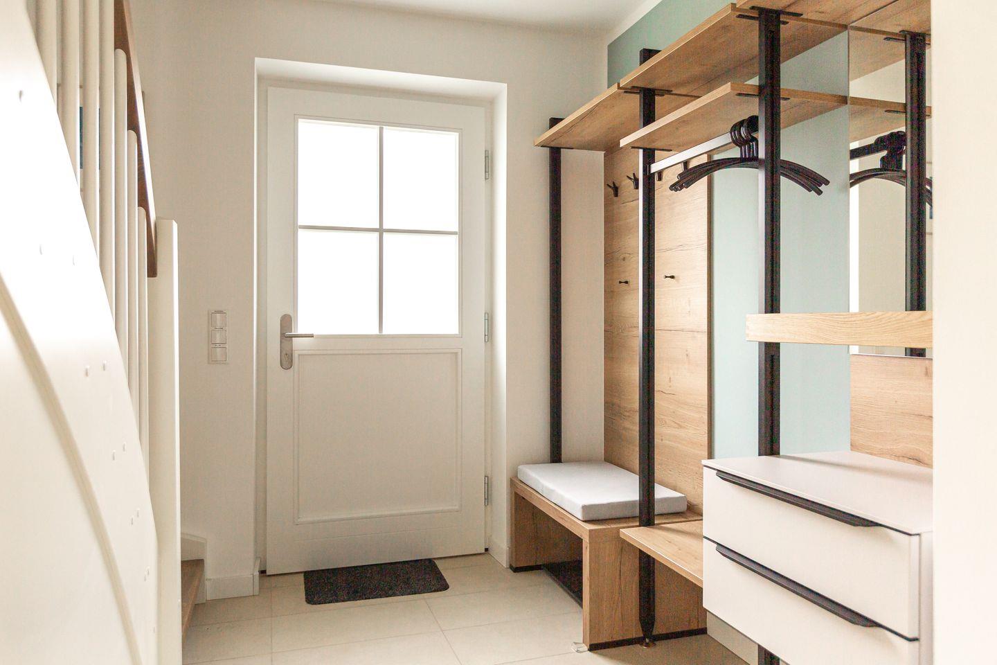 Umgeben von alten Reetdachkaten fügt sich das neu erbaute Ferienhaus Windlooper harmonisch in die Umgebung ein und beweist, dass moderne Architektur in keinem Widerspruch zur traditionellen Darßer Bauweise steht. Bei Betreten der Ferien-Doppelhaushälfte zeigt sich, dass auch die Inneneinrichtung einem Designkonzept folgt, dass klare Linien und Formen, helle Farben und Naturmaterialien in den Fokus stellt. Durch den Flur geht es in den offen gestalteten Wohn- und Küchenbereich. Das gemütliche Sofa, der Relaxsessel, bodentiefe Fenster und der Kamin versprechen erholsame Stunden wenn es mal nicht in die Natur geht. Zur anderen Seite steht eine vollausgestattete Küche zur Verfügung. Hier lässt es sich nach Herzenslust kochen und klönen. Ein erstes Badezimmer mit Dusche und WC sowie die hauseigene Sauna befinden sich ebenfalls im Erdgeschoss. Für einen wohltuende Saunagang sind lediglich Zwei-Euro-Stücke notwendig. Verschiedene Saunaaufgüsse und ein herrliches Wellness-Erlebnis gibt es dafür inklusive.