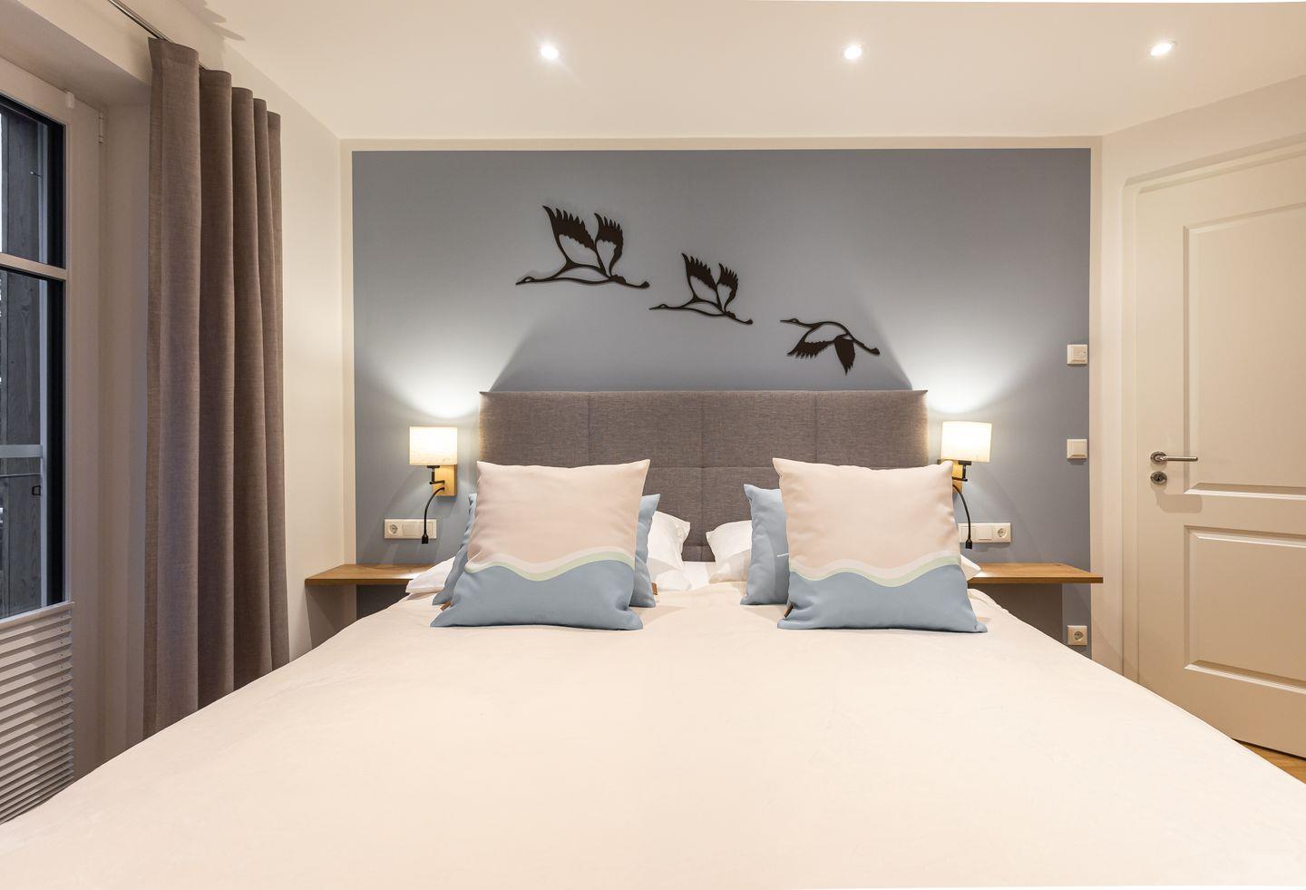 Über die Treppe erreicht man die beiden liebevoll und hochwertig ausgestatteten Schlafzimmer. Großzügige Boxspringbetten, Ablageflächen für Kleidung und stilvolle Beleuchtung sorgen für eine gemütliche Atmosphäre und einen erholsamen Schlaf. Mit einem zweiten Tageslichtbad, dass über eine Dusche und Badewanne verfügt, wird der Wohnkomfort abgerundet.