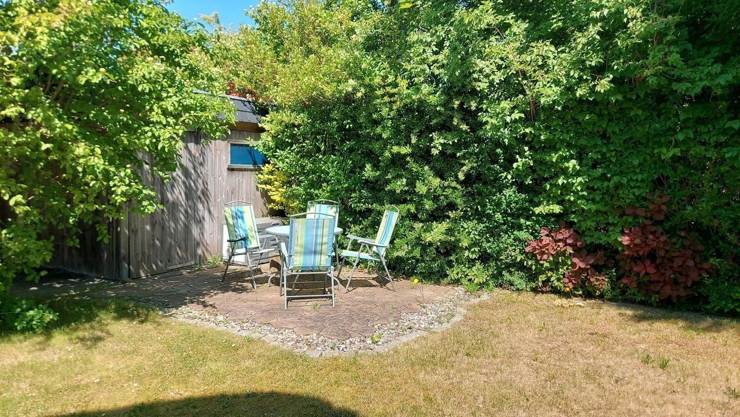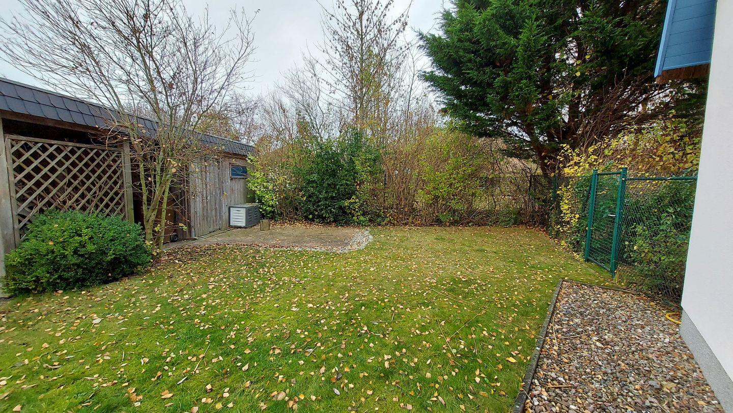 Verfügbar ist eine Gartenterrasse, ein Carport sowie eine gesicherte Unterstellmöglichkeit für Ihre Räder.