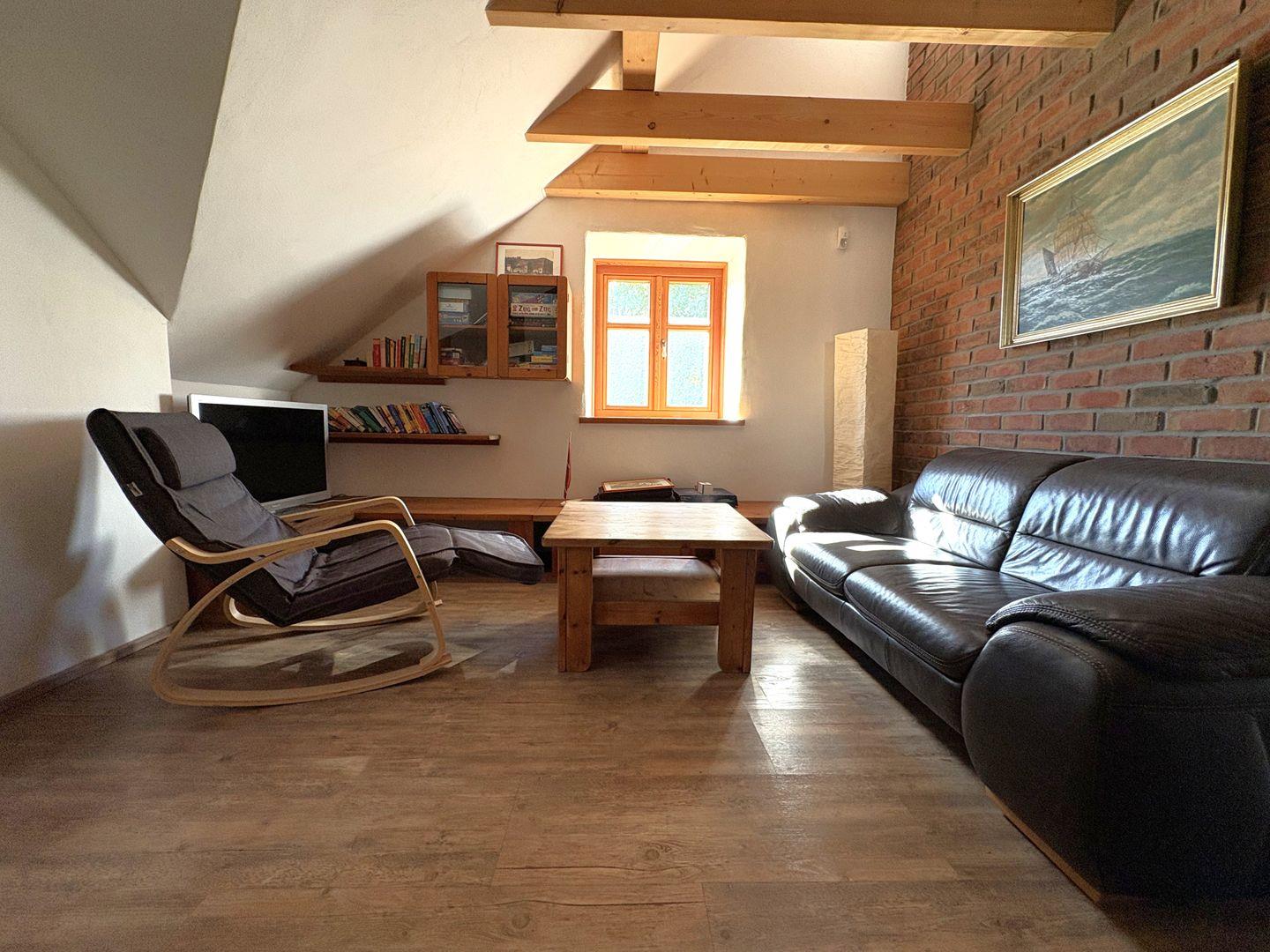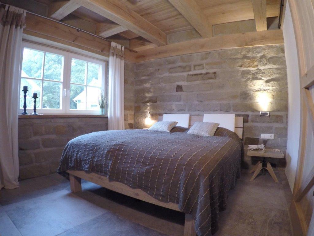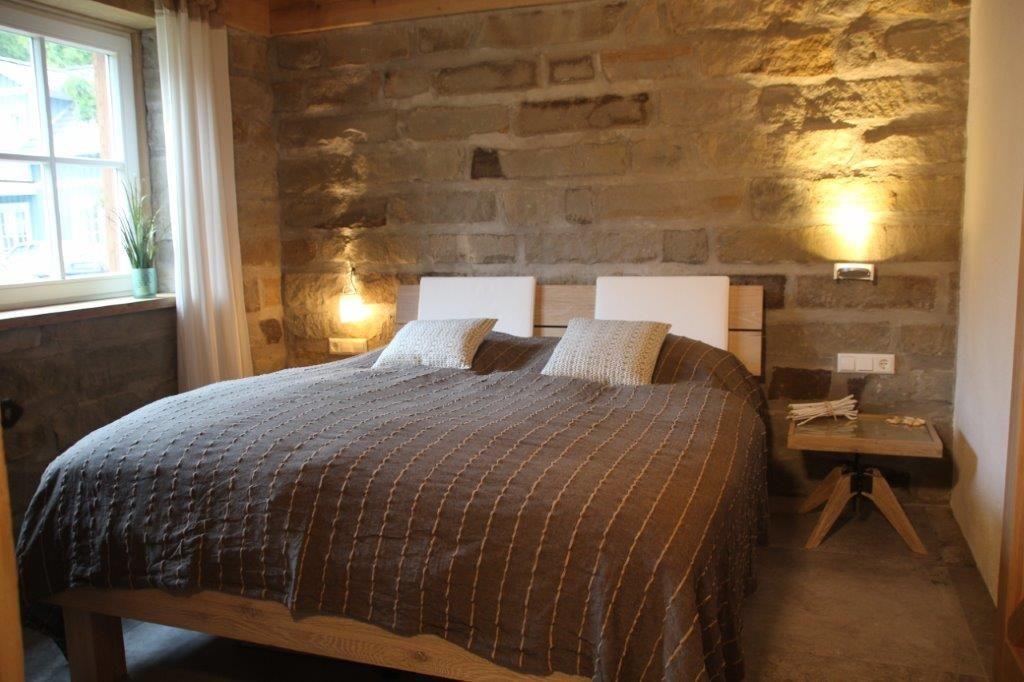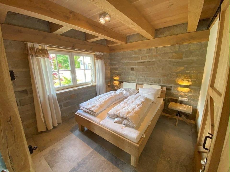 Unsere großzügige Ferienwohnung im Erdgeschoss bietet auf 82 m² Platz für bis zu vier Personen. Zwei gemütliche Schlafzimmer mit Doppelbetten garantieren erholsame Nächte. Der offene Wohnbereich ist mit einer großen Eck-Ledercouch ausgestattet und lädt zum Entspannen ein. Die offene Küche ist voll ausgestattet. Viel naturbelassenes Eichenholz und Natursteinmauern verleihen der Wohnung einen besonderen Charme. Der Kaminofen sorgt für wohlige Wärme und eine gemütliche Atmosphäre.