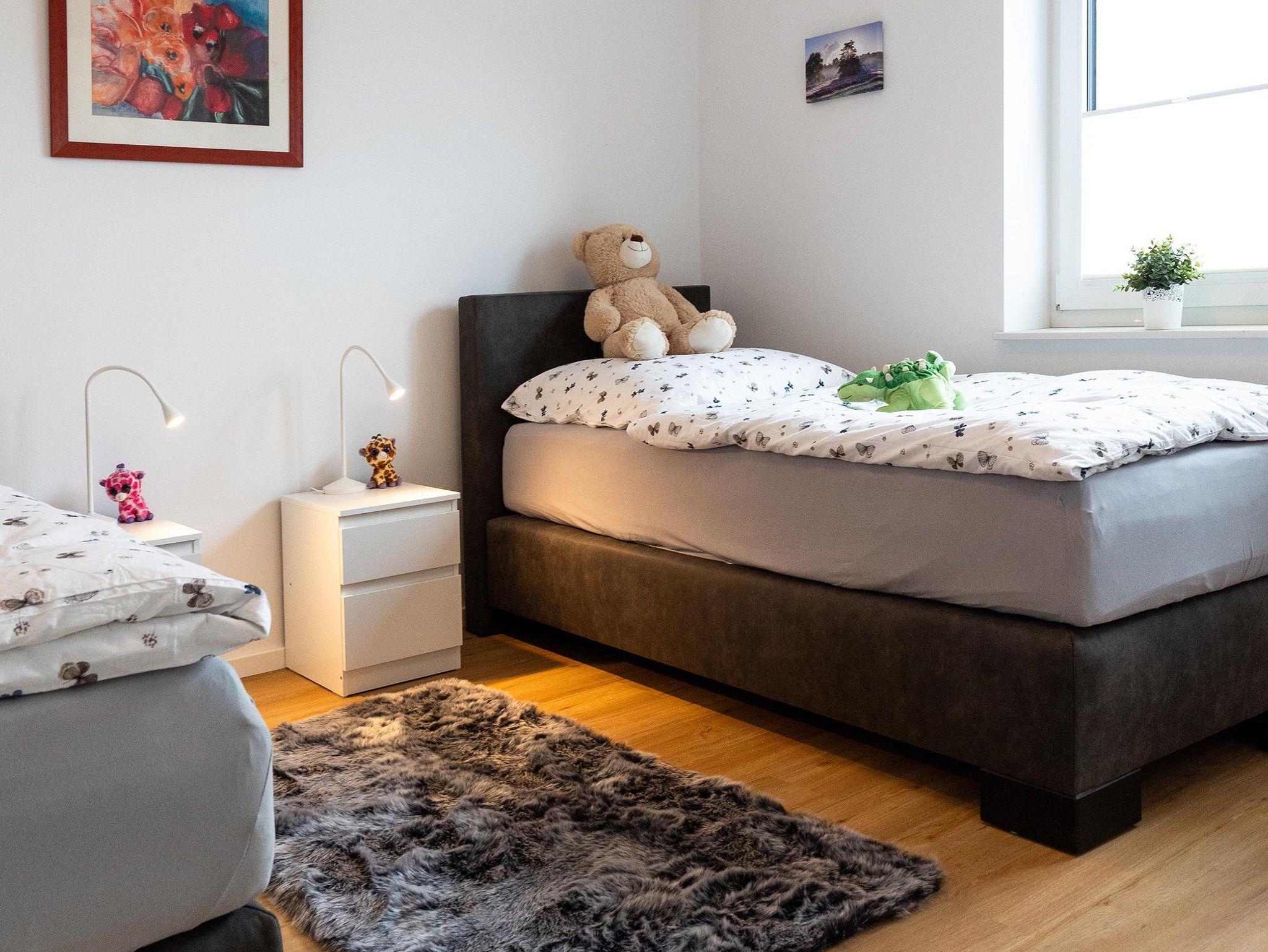 Unser 2024 fertiggestellter Bungalow bietet Ihnen einen ebenerdigen Komfort. Auf 135 m² modern eingerichteter Wohnfläche finden Sie einen großzügigen Eingangsbereich, einen großen Koch-, Ess- und Wohnbereich, drei Schlafzimmer sowie ein Gäste-WC und ein Vollbad. Das Hauptschlafzimmer ist mit einem Doppelbett ausgestattet, von welchem aus Sie einen tollen Blick in die Natur genießen können. Die zwei weiteren Schlafzimmern sind jeweils mit zwei Einzelbetten ausgestattet, welche zu einem Doppelbett zusammengeschoben werden können. Die Küche verfügt über eine Kücheninsel und ist mit allem Notwendigen ausgestattet. ein großer Esstisch für 6 Personen und eine gemütliche Wohnlandschaft runden den Raum ab. Ein Highlight des Hauses ist die angehobene Raumdecke im Essbereich, die den Blick bis unter das Dach führt. Im Haus-Technik-Raum stehen Waschmaschine und Trockner zur Verfügung. Im Außenbereich stehen Ihnen eine großzügige Terrasse sowie ein eigener Garten zur Verfügung.