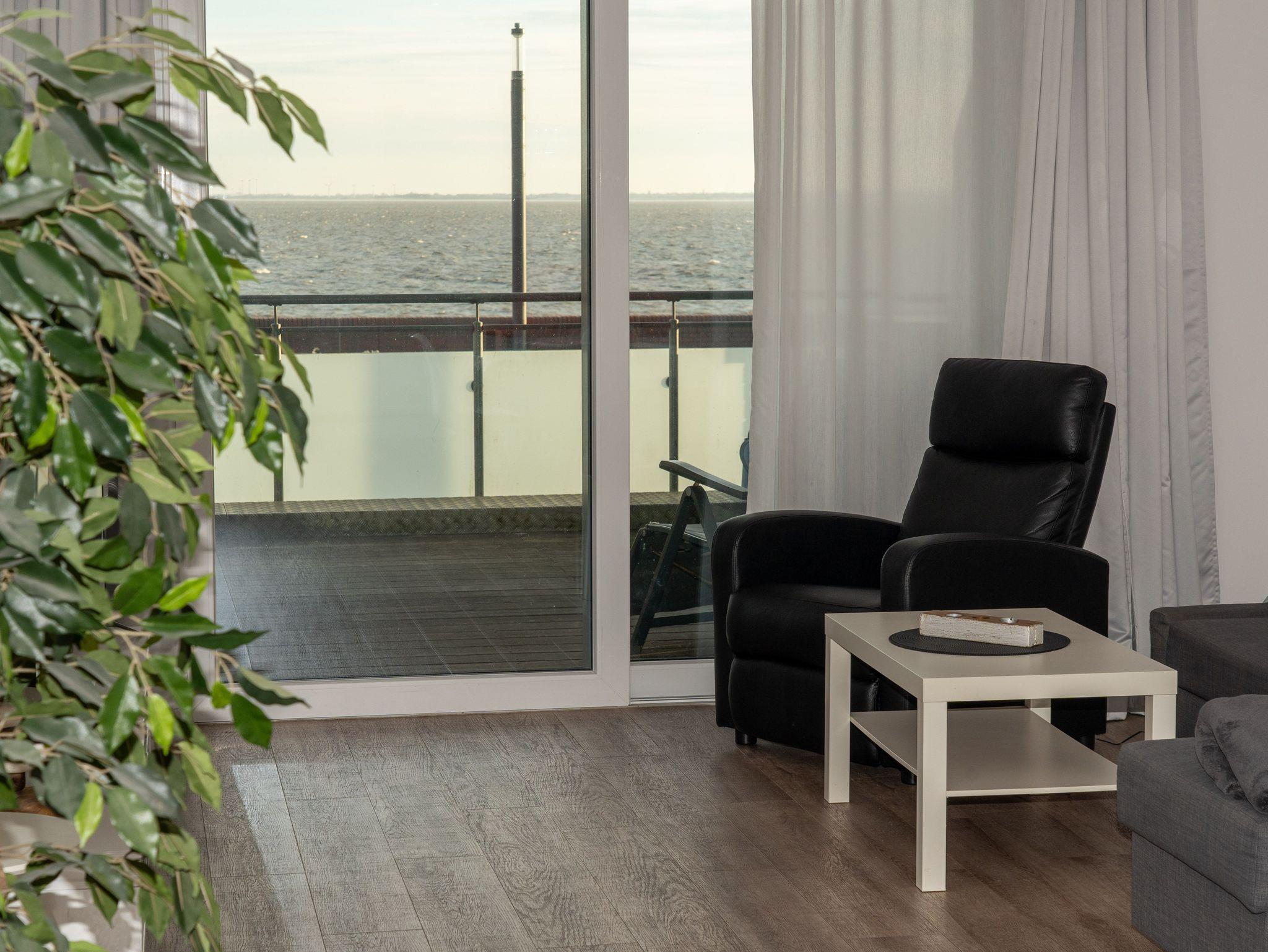 Das Sofa kann zu einer zusätzlichen Schlafgelegenheit umgebaut werden. Im Schlafzimmer befindet ein großes Doppelbett und ein Kleiderschrank. Vom Wohn- und Schlafzimmer gelangen Sie auf den Balkon mit Blick auf die Nordsee bis hin zum Leuchtturm Arngast.