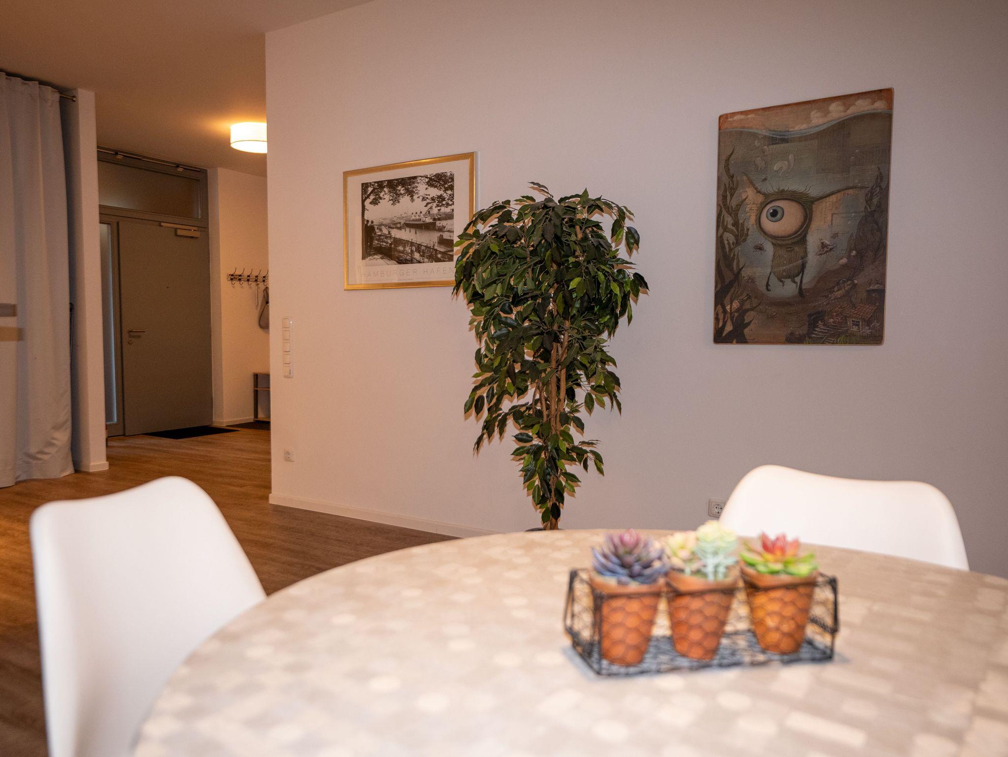 Nach dem Betreten der Wohnung in der 1.Etage gelangt man durch einen Flur in den großzügigen Wohn- und Essbereich, der gemütlich, stilvoll eingerichtet und lichtdurchflutet ist. Die moderne Küche mit einem Esstresen ist umfangreich ausgestattet. Ein Esstisch mit vier Stühlen lädt zum Essen, Spielen oder Arbeiten ein.