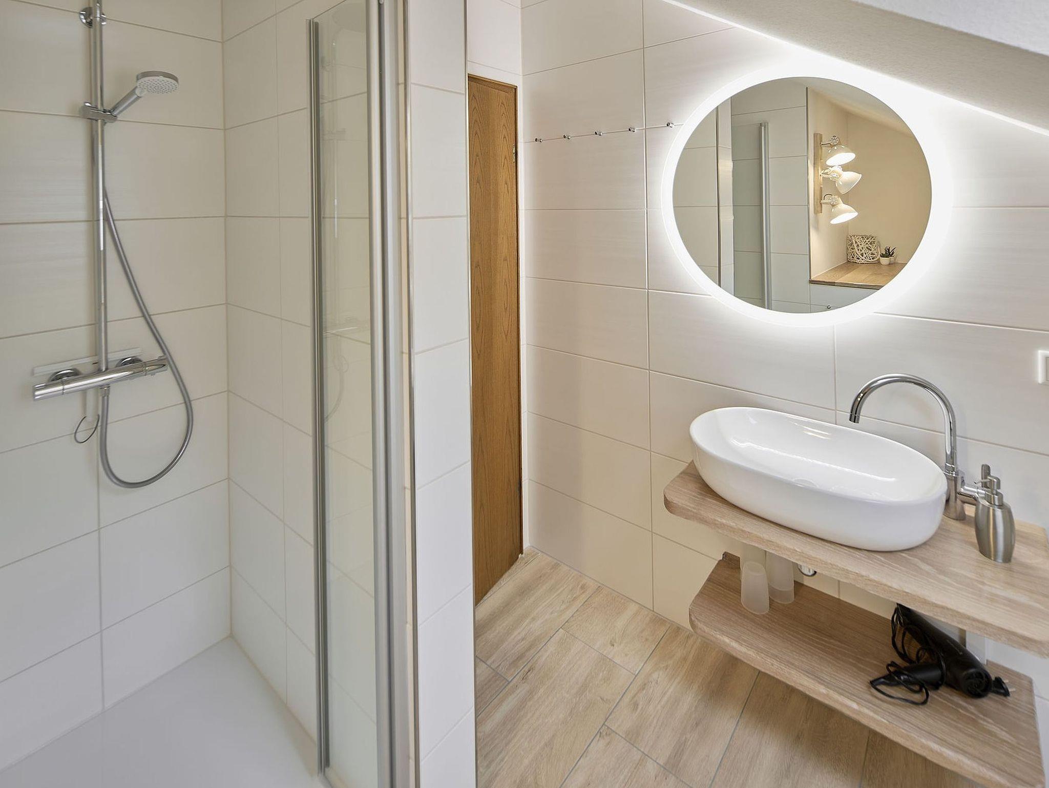 Des Weiteren verfügt die Ferienwohnung über ein Schlafzimmer mit einem Doppelbett und einem Einzelbett sowie einem Badezimmer mit Dusche. Ein Föhn liegt natürlich schon für Sie bereit.