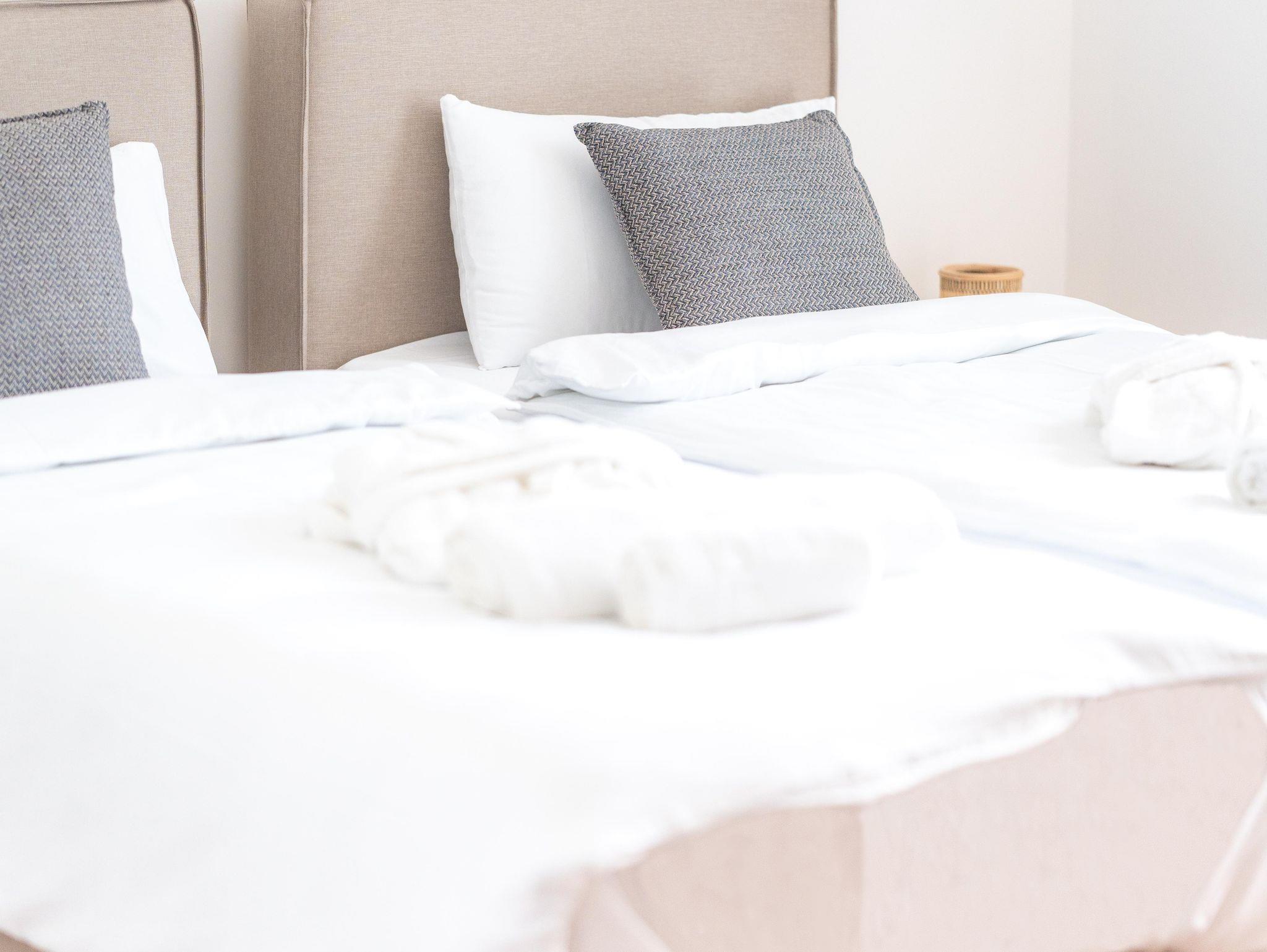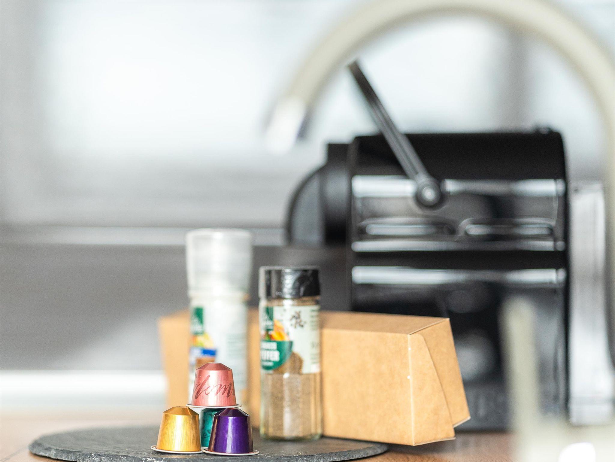 Ein besonderes Highlight ist die Raumtrennung, die den Ess- und Wohnbereich angenehm voneinander abgrenzt und für zusätzliche Gemütlichkeit sorgt. Die Terrasse lädt zum Entspannen im Freien ein. Frische Handtücher, Bettwäsche und kostenfreie Parkplätze sind inklusive. In der voll ausgestatteten Küche finden Sie alles, was Sie benötigen. Mikrowellen und Backöfen können ausgeliehen werden, Waschmaschine und Trockner stehen gegen Aufpreis zur Verfügung.