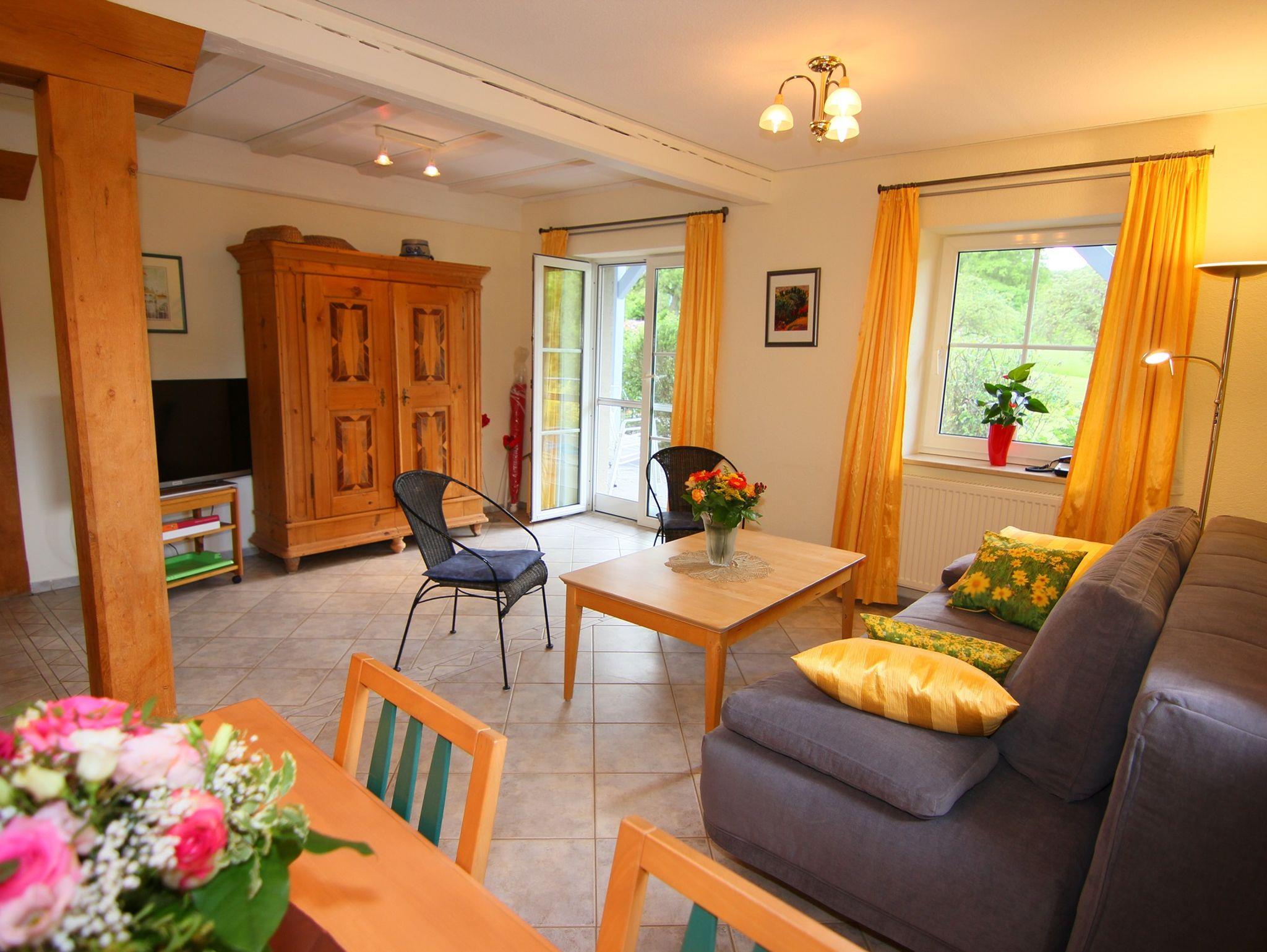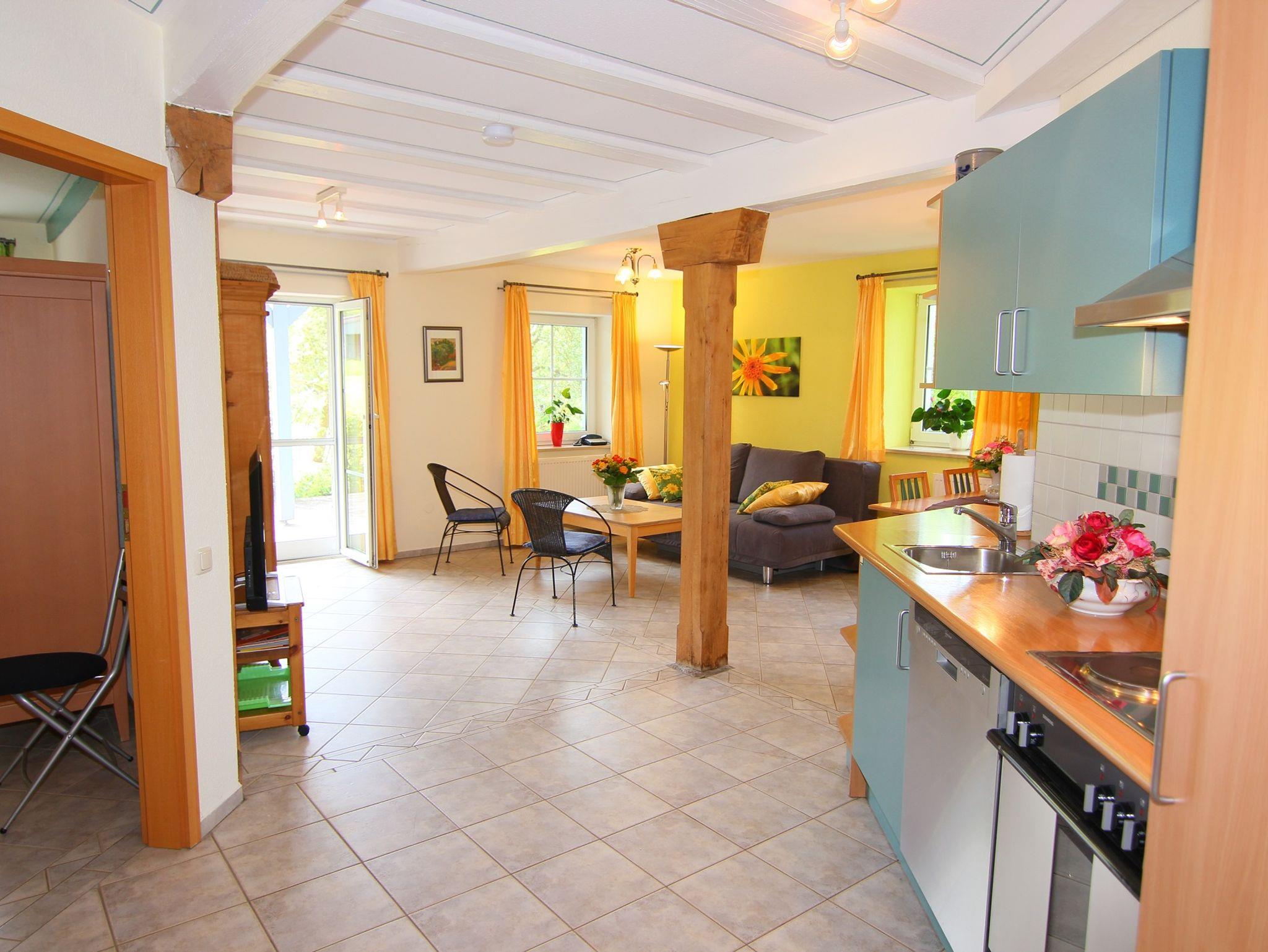 Die schöne Ferienwohnung Arnika ist 70qm groß, im Erdgeschoss und behindertengerecht (Schwellenfrei, mit 1m breiten Türen und großer, rollstuhlgerechter Dusche/WC). Der kombinierte Wohn- und Essraum ist dank der vielen Fenster lichtdurchflutet. Das gemütliche Wohnzimmer ist mit großer Couch,einem kleinen Tisch mit zwei Stühlen, einem modernem SAT-TV sowie mit einem Esstisch ausgestattet. Die vollausgestattete Küche mit Backofen, Herd, Geschirrspüler, Kühlschrank, Kaffemaschine,... lädt zum Kochen ein. Das geräumige Bad verfügt über Dusche und WC. Außerdem gehört zu der Ferienwohnung eine sehr große (40qm) Südterrasse mit freiem Blick ins Grüne.