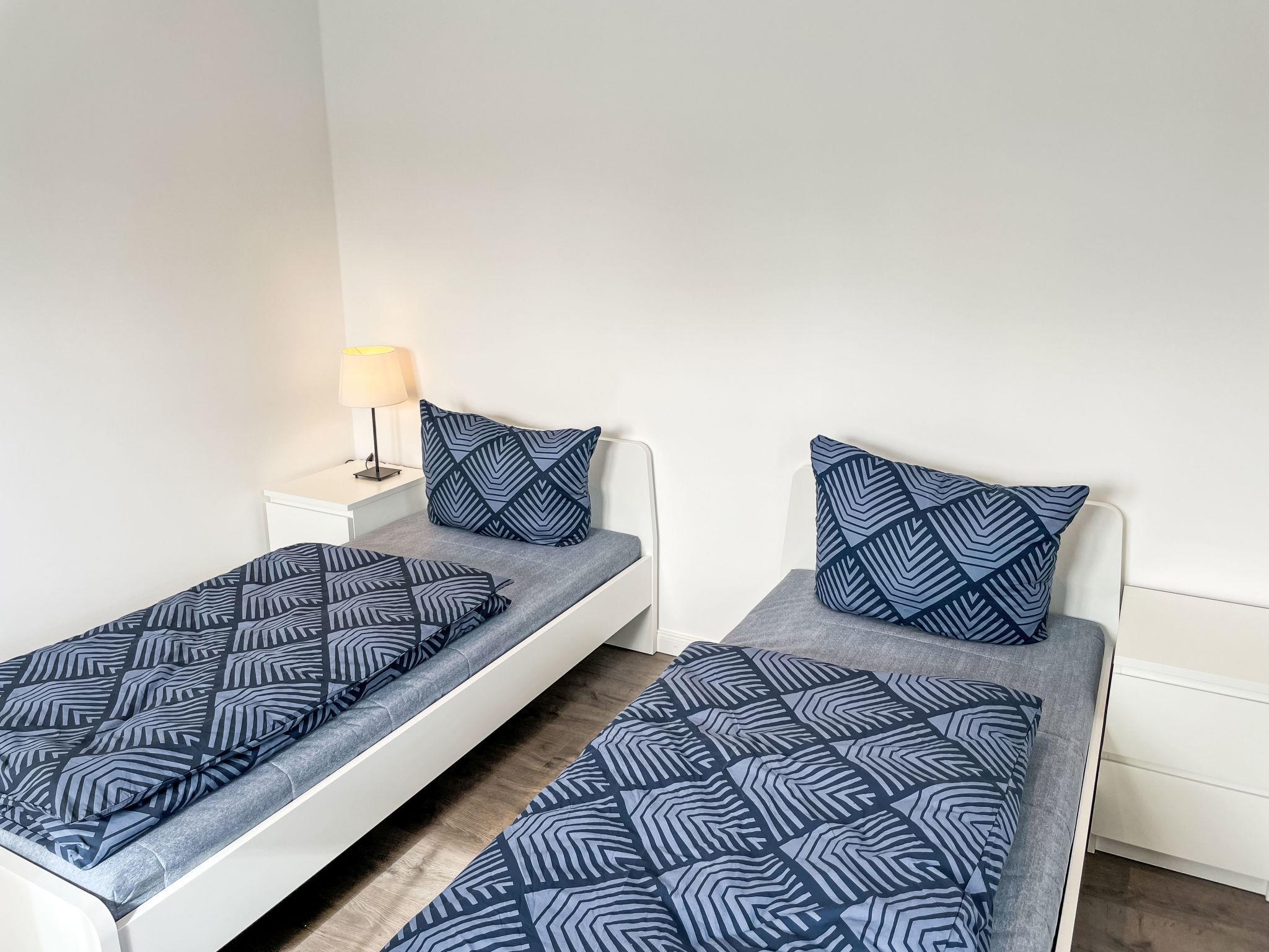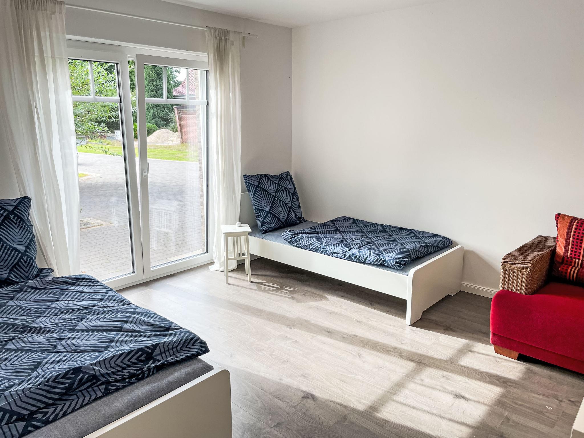 "Meyer", 4-room apartment 200 m2, on the ground floor. Spacious, very comfortable and modern furnishings: large living/dining room with dining table and satellite TV (flat screen). Exit to the garden, to the terrace. 1 room with 1 double bed (180 cm, length 200 cm), satellite TV (flat screen). 2 rooms, each room with 2 beds (90 cm, length 200 cm), satellite TV (flat screen). Interconnecting room with 1 bed (90 cm, length 200 cm). Large, open kitchen (oven, dishwasher, 4 ceramic glass hob hotplates, toaster, kettle, microwave, electric coffee machine). Shower/WC, bath/shower/WC. Gas heating. Terrace roofed, large garden. Terrace furniture, barbecue. Facilities: washing machine, children's high chair, baby cot. Internet (WiFi, free). Please note: suitable for families. Non-smokers only.