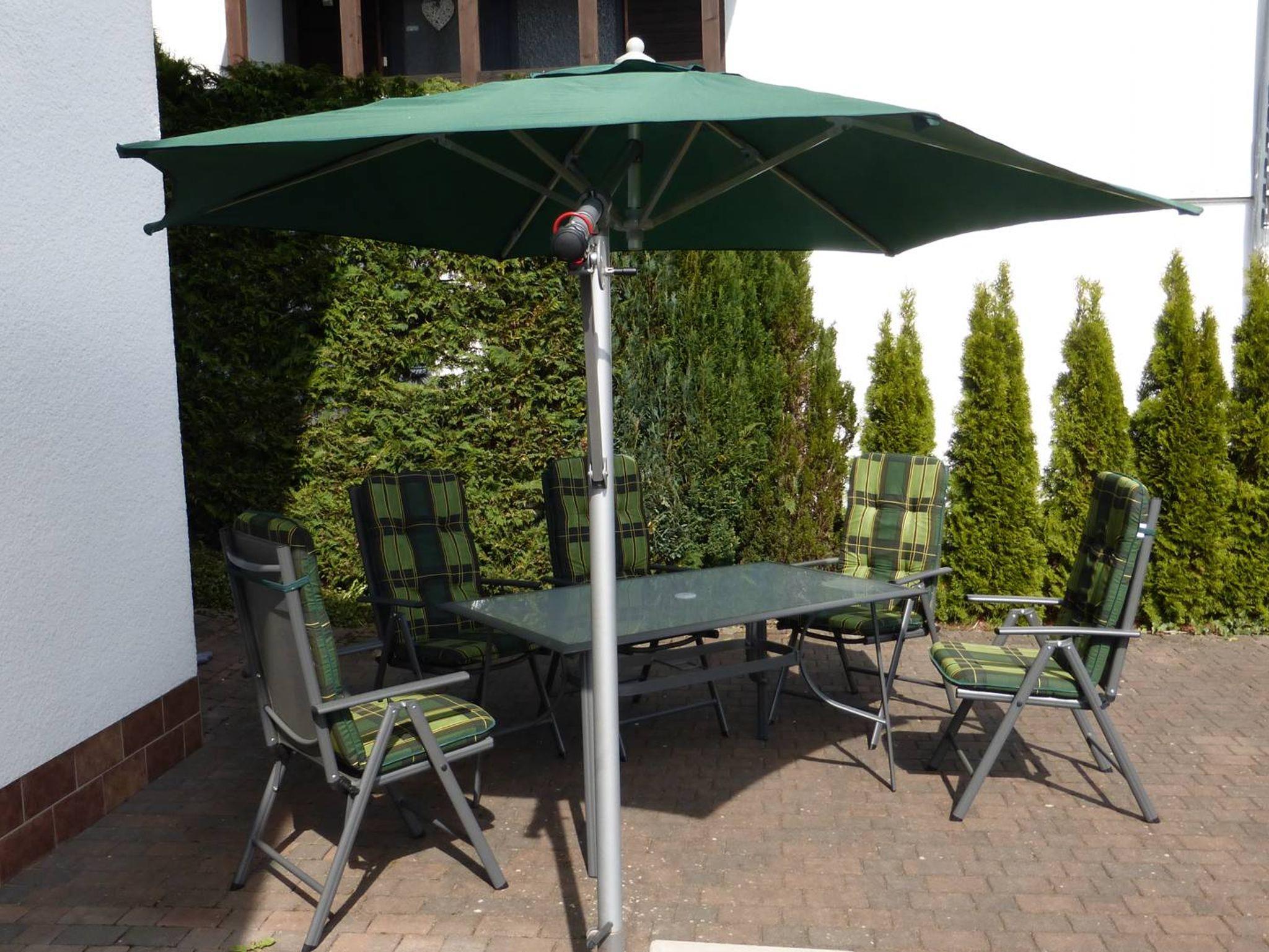 Terrasse und Garten: Holzbank, Gartenliegen, Tisch mit Stühlen und Sonnenschirm,