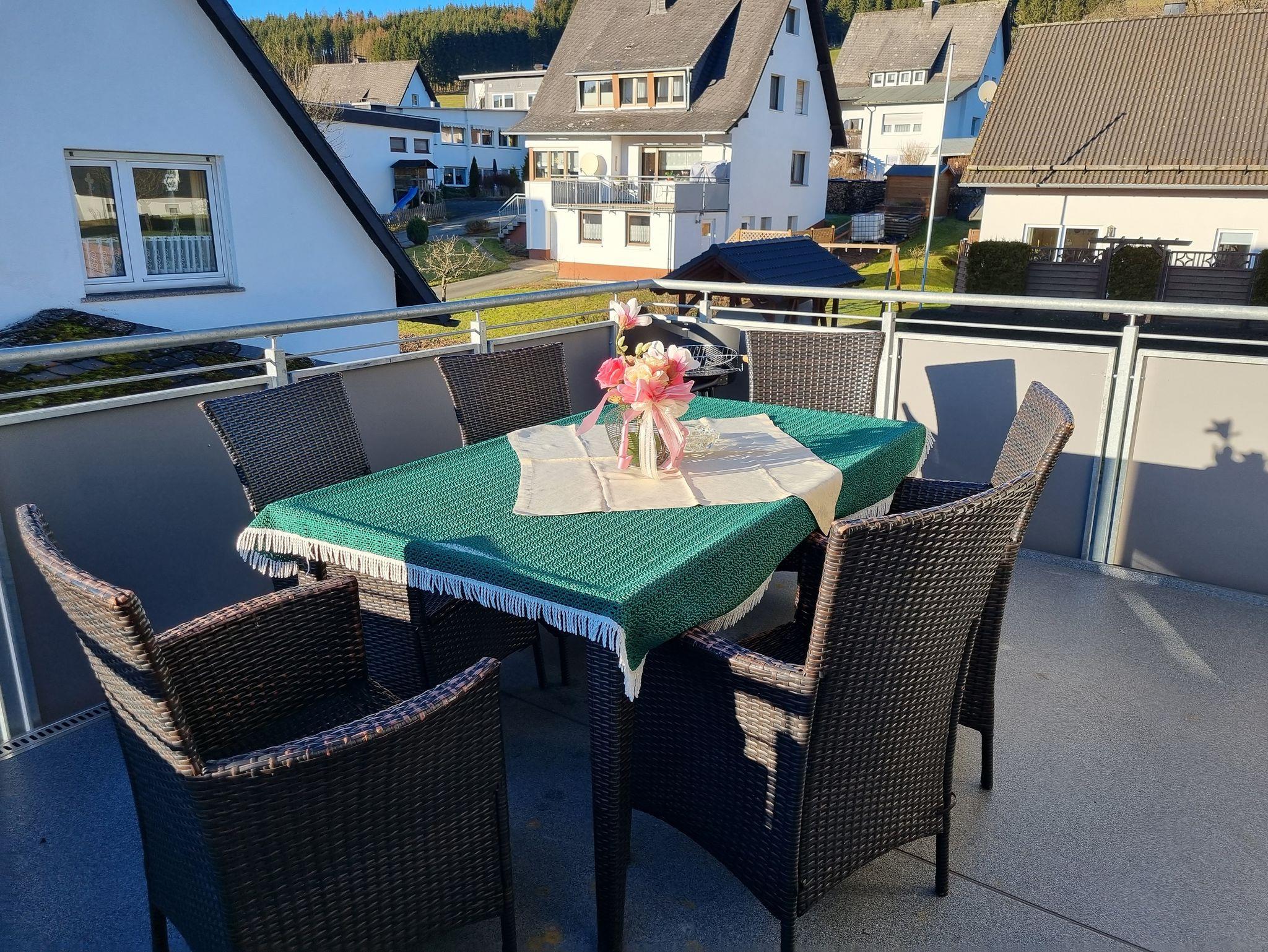 Komfortable Ferienwohnung in ruhiger, bevorzugter Wohnlage Südhang mit herrlichem Ausblick über den Luftkurort Züschen, für 2-5 Personen, Balkon (15qm) mit Sitzgruppe und Grill. Küche mit Elektroherd, Backofen, Dunstabzugshaube, Kaffeemaschine, Wasserkocher, Mikrowelle, Spülmaschine etc.; zwei Doppelbett-Schlafzimmer mit eigener Waschgelegenheit Zustellbetten möglich, Wohnzimmer mit Sitzgarnitur, Essecke,Kabelfernsehen, Wii, Diele, Bad: mit Dusch und WC, sep Gäste WC Parkplatz+ WLAN kostenfrei. EXTRA Sauerland - Sommer - Card !! Skigebiet Züschen Luftlinie 1,4 Km