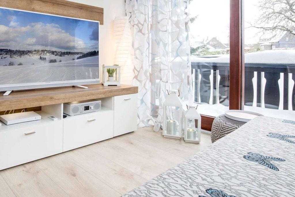 Die hochwertig Ferienwohnung "Astenperle I" ist idyllisch und in unmittelbarer Nachbarschaft zum Skikarussel von Winterberg-Altastenberg gelegen. Der Skilift Sahnehang ist nur wenige Gehminuten entfernt. Die Wanderwege rund um den "Kahlen Asten" liegen ebenalls vor der Haustür. Die Ferienwohnung verfügt über ein Schlafzimmer mit Boxspringbett, einem Wohnzimmer mit hochwertiger Schlafcouch (mit Lattenrost), einen großen Balkon, einer gemütlichen Loogia mit Blick auf die Landschaft, einer separaten und vollausgestatteten Küche (u. a. Spülmaschine, Kaffeevollautomat etc.) und einem Bad (Dusche / Badewanne). Highlights der Ferienwohnung sind eine Infrarotsauna mit Farblichttherapie, Luftreiniger, Balkon und eine begehbare Badewanne.