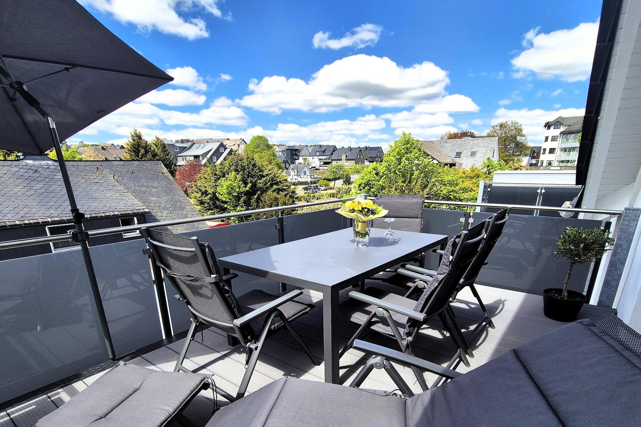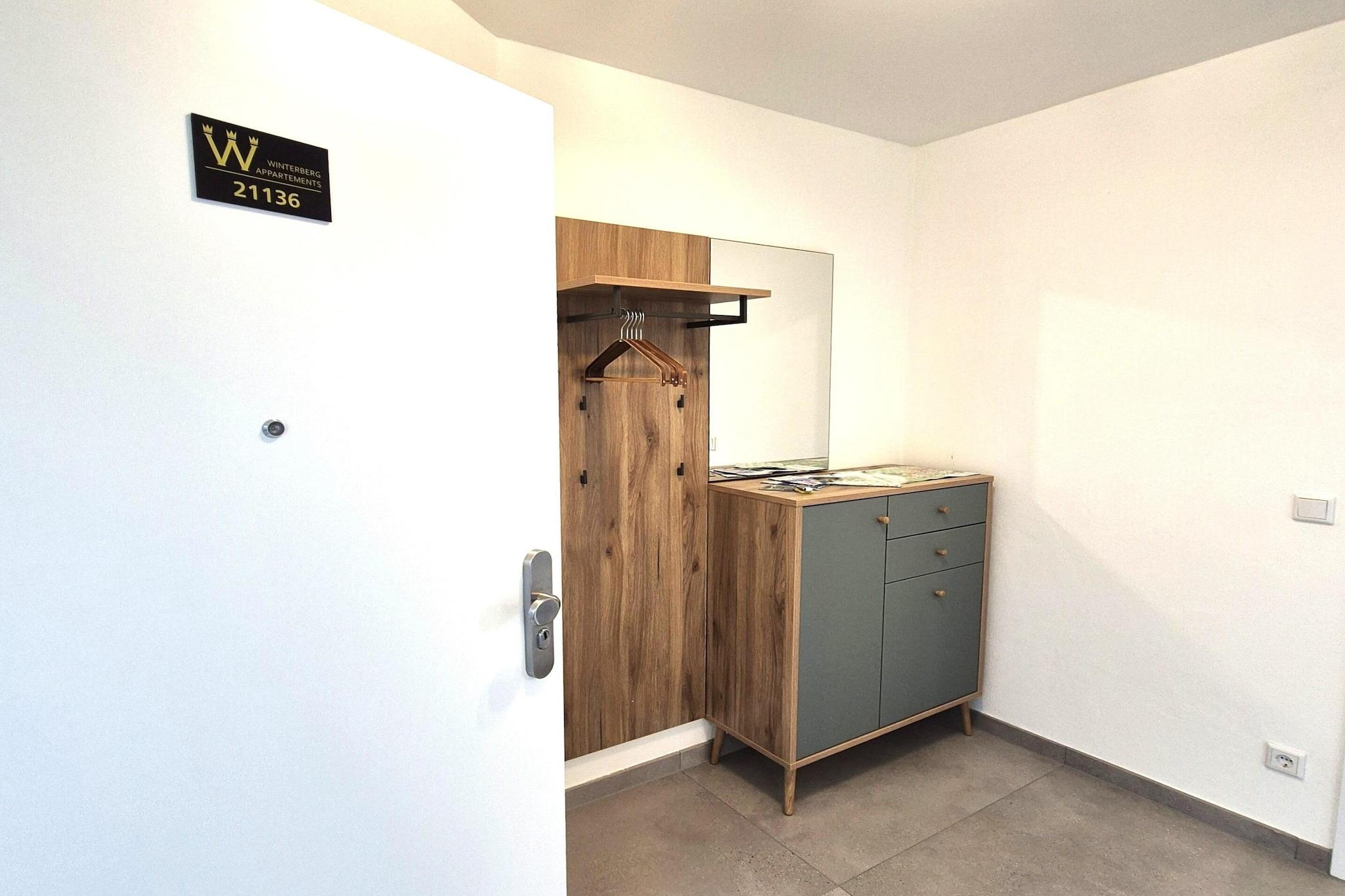 Denne lyse og stilfulle tomannsboligen ligger rolig, men sentralt i Winterberg, bare 500 meter fra skiheisens karusell og 200 meter fra det sjarmerende torget, og tilbyr vidstrakt utsikt over de nærliggende bakkene og alle bekvemmeligheter som trengs for en avslappende fjelltur. Med en areal på 90 m² fordelt på to etasjer, har leiligheten plass til opptil fem gjester. Hovedetasjen har en romslig stue/spisestue med TV, et moderne åpent kjøkken som fører til en privat balkong, og et stort bad utstyrt med en tilgjengelig dusj, toalett, vask og en forfriskende infrarød badstue. Ovenpå huser et åpent galleri et koselig dobbelt soverom med en andre TV (merk: dette er et åpent rom), som fører til et annet dobbelt soverom og et tredje rom med en enkeltseng – perfekt for familier eller små grupper. Gjestene drar nytte av raskt Wi-Fi og en privat parkeringsplass i den underjordiske garasjen, som inkluderer et sikkert oppbevaringsrom for sykler, kjelker, ski og støvler. Enten du skal i bakkene, gå på tur på naturskjønne stier eller utforske de lokale kafeene og butikkene, er alt Winterberg har å tilby rett utenfor døren.