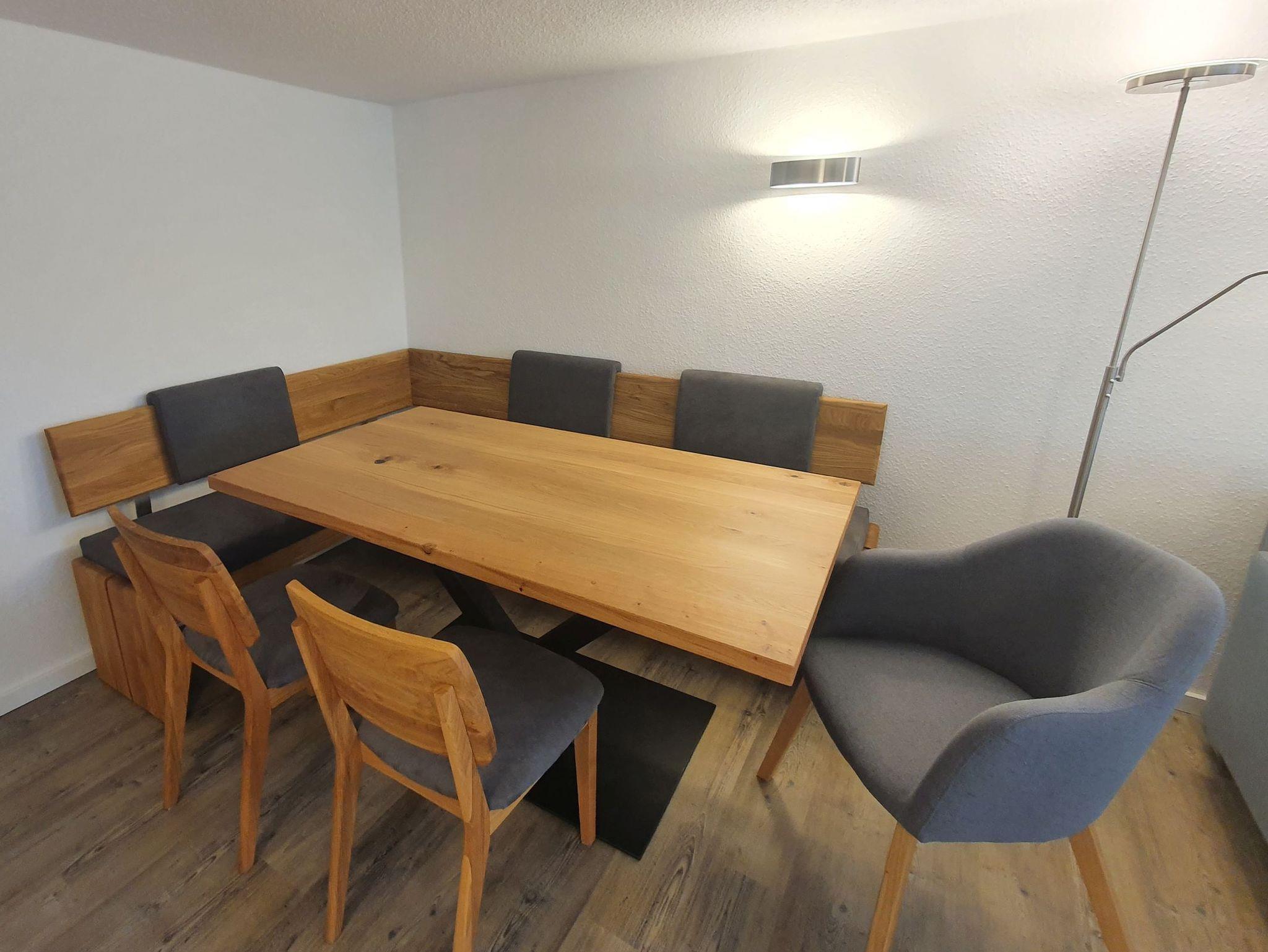 Im Wohn-/Esszimmer findet sich eine geräumige Essecke, sowie ein Sofa auf dem man es sich für Fernsehabende gemütlich machen kann. Das Smart-TV bietet Kabelfernsehen und Zugang zu den üblichen Streamingdiensten (bei Nutzung Ihrer persönlichen Zugangsdaten)