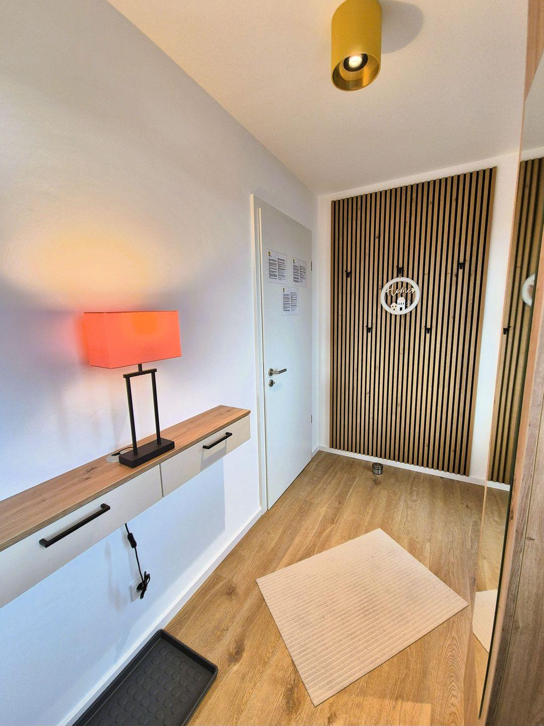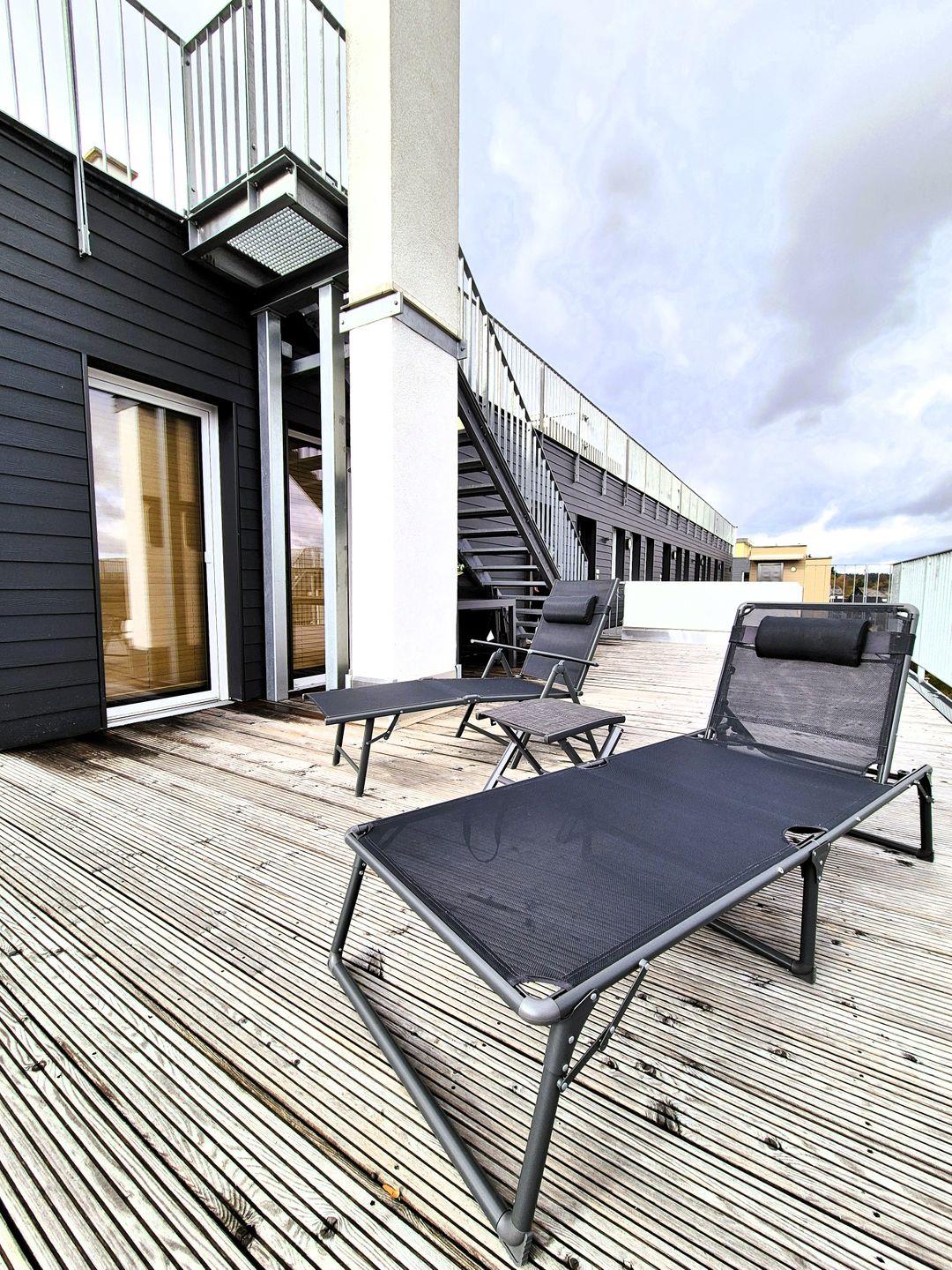 Die insgesamt ca. 54 m² Wohnfläche verteilen sich auf einen Flur, ein kleines Wohnzimmer mit Fernseher und einem 1,60 m breiten Schlafsofa für die 3. und 4. Person, eine integrierte, offene, perfekt ausgestattete Küche und ein geschmackvolles Schlafzimmer mit Doppelbett (Boxspringbett) und einem zweiten Fernseher. Die Wohnung verfügt außerdem über ein geräumiges Badezimmer mit einer Infrarotkabine für 2 Personen und einer Waschmaschine. Vom Wohnzimmer und vom Schlafzimmer aus gelangt man auf die 123 m² große Dachterrasse, die eine atemberaubende Aussicht bietet. Die Dachterrasse ist selbstverständlich mit Gartenmöbeln ausgestattet.
