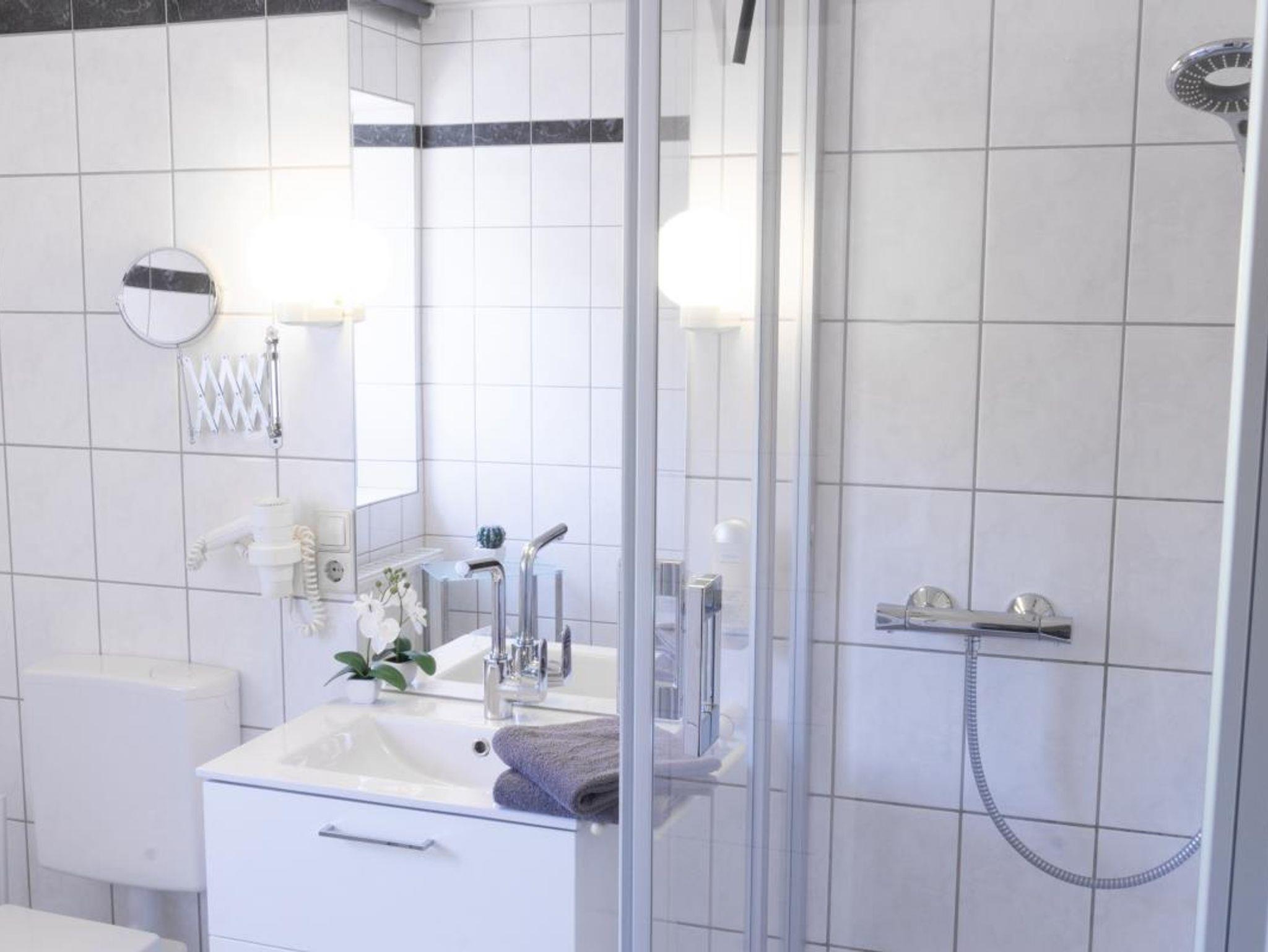 Zu jedem Zimmer gehören DU/WC, Haarfön, Seife, Kosmetikspiegel, Sat-TV, Radiowecker und Wasserkocher.