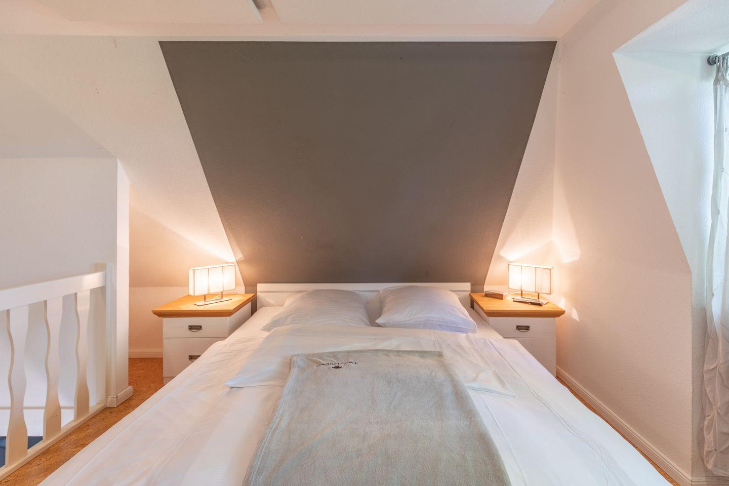 Über eine offene Treppe erreichen Sie das Schlafzimmer im Obergeschoss mit einem Doppelbett (180 x 200), Einbauschränken und einem Duschbad.