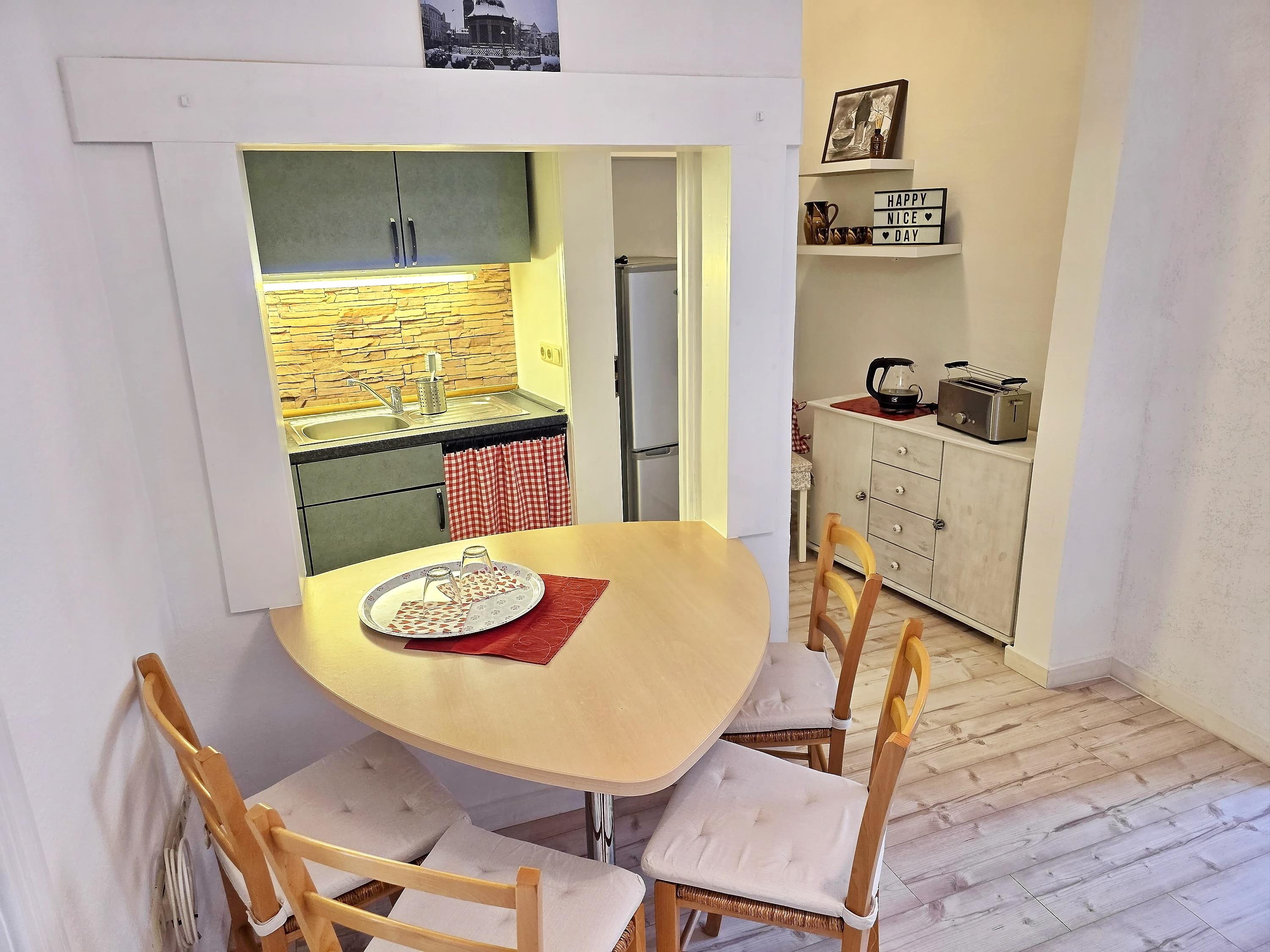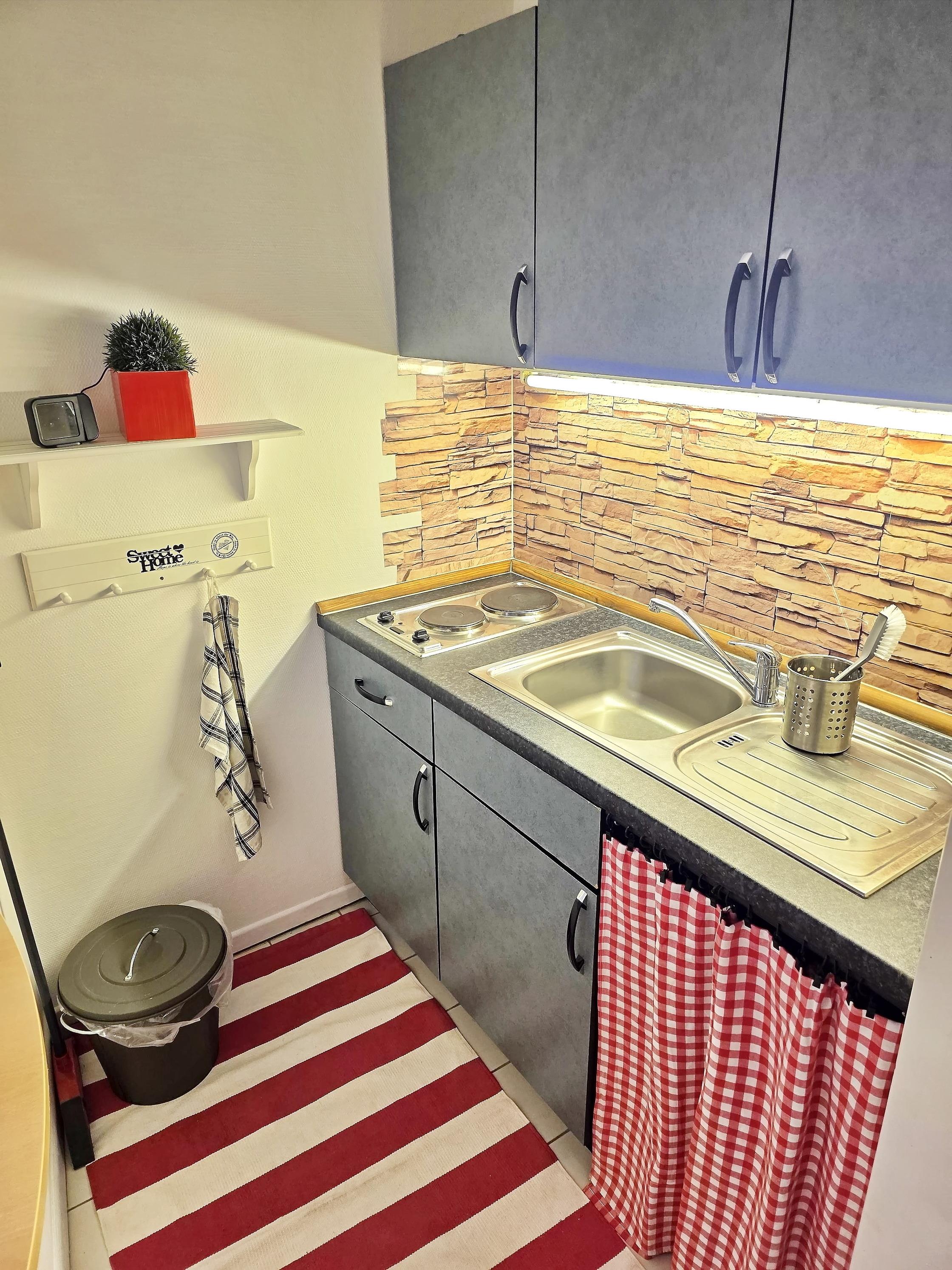 Die kleine Küche ist vollständig ausgestattet und bietet alles, was Sie für die Selbstversorgung benötigen. Dazu gehören unter anderem Kochmöglichkeiten, Kühlschrank, Kaffeemaschine, Wasserkocher, Toaster sowie Geschirr und Besteck. Hier können Sie bequem Ihre Lieblingsgerichte zubereiten.