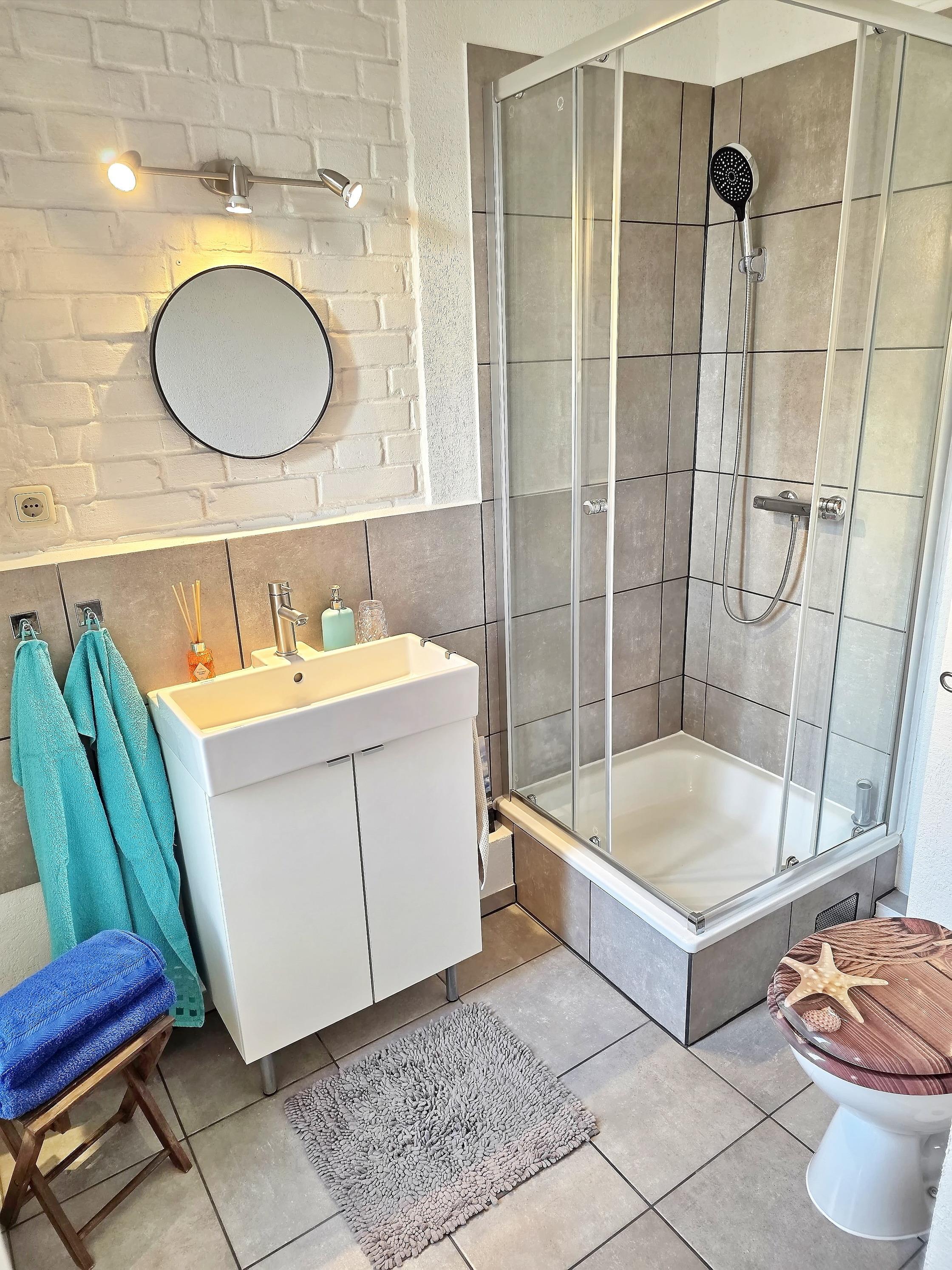 Das Badezimmer ist modern gestaltet und mit Dusche, WC sowie praktischen Ablageflächen ausgestattet.