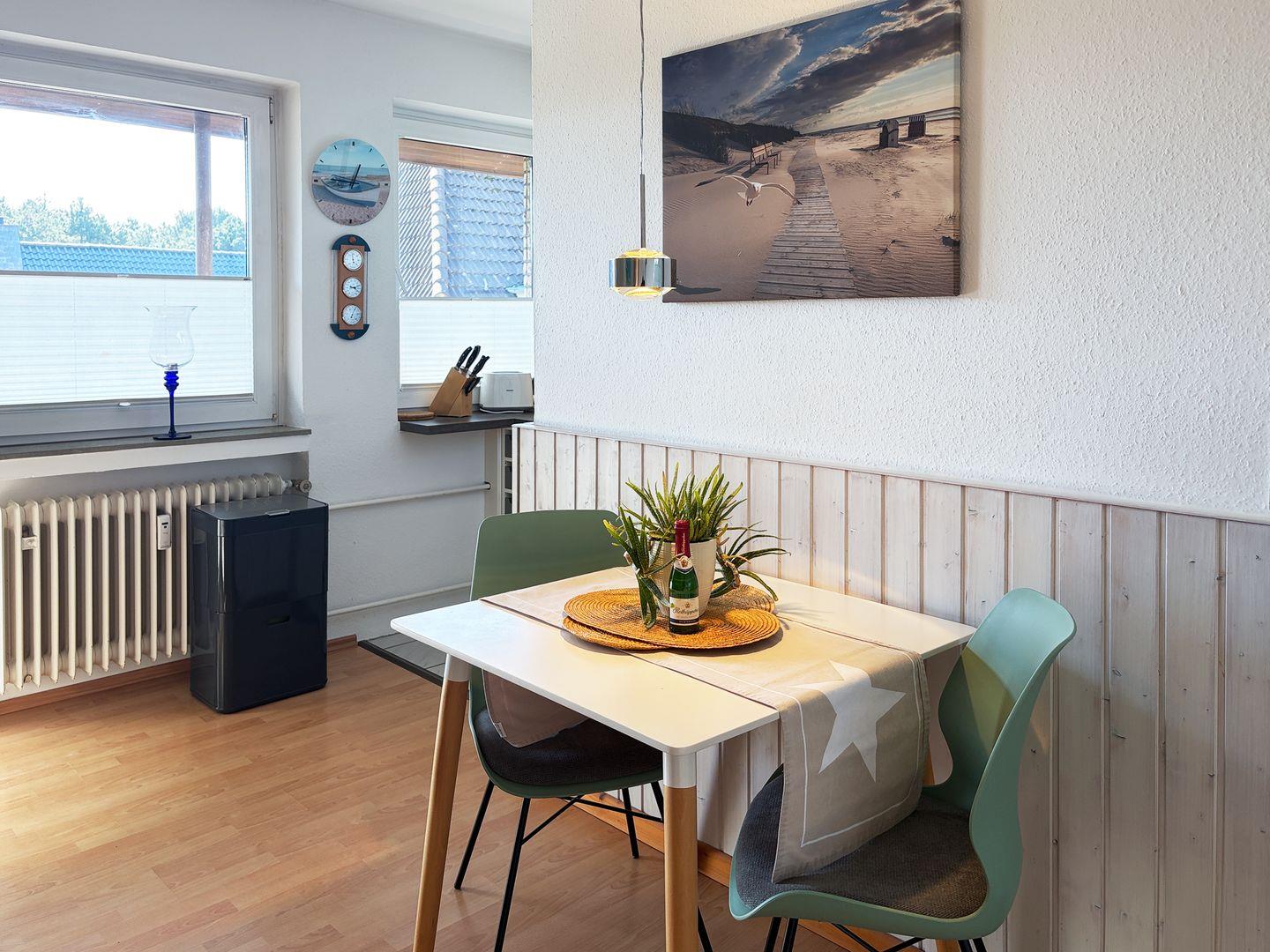Die Wohnung verfügt über einen Wohnraum mit WLAN, TV und offener Kochnische, ein Schlafzimmer, ein Badezimmer mit Dusche/WC und einen überdachter Süd-Balkon (Loggia) mit Gartenmöbeln (von April bis Oktober).