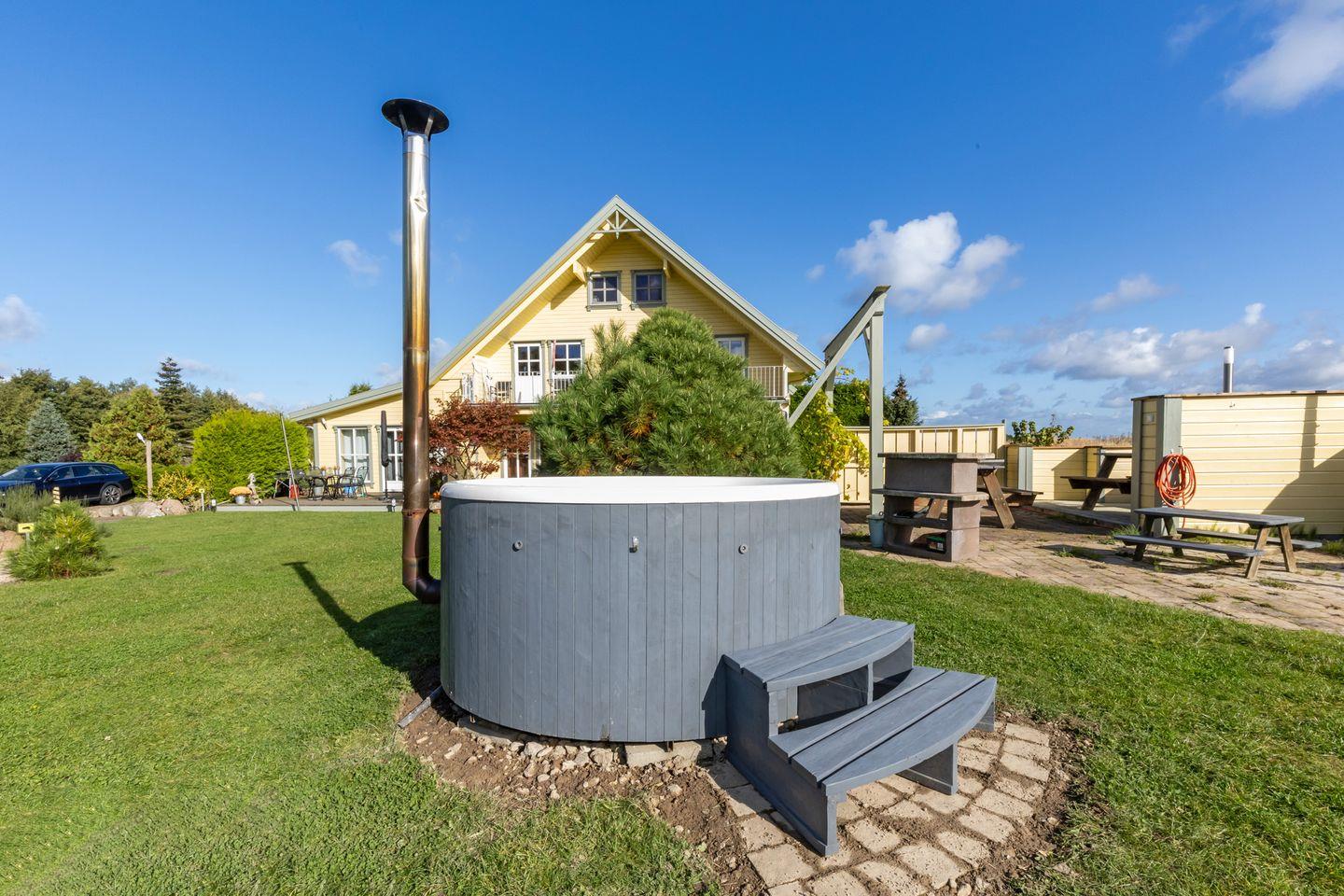 Ruhig gelegene 3-Raum-Ferienwohnung mit Kamin, Sauna, Hot Tub und großem Balkon – direkt am Golfplatz Wittenbeck. Auf 70 m² erwartet Sie moderner Komfort mit zwei Schlafzimmern, offenem Wohn- und Essbereich, voll ausgestatteter Küche und herrlichem Blick ins Grüne. Ideal für Paare und Familien, die Erholung in Ostseenähe suchen. Das große Grundstück mit Grillplatz, Fasssauna und Hot Tub sorgt für Wellness und Entspannung unter freiem Himmel. ACHTUNG! Die Außensauna ist derzeit ohne Betrieb!!!