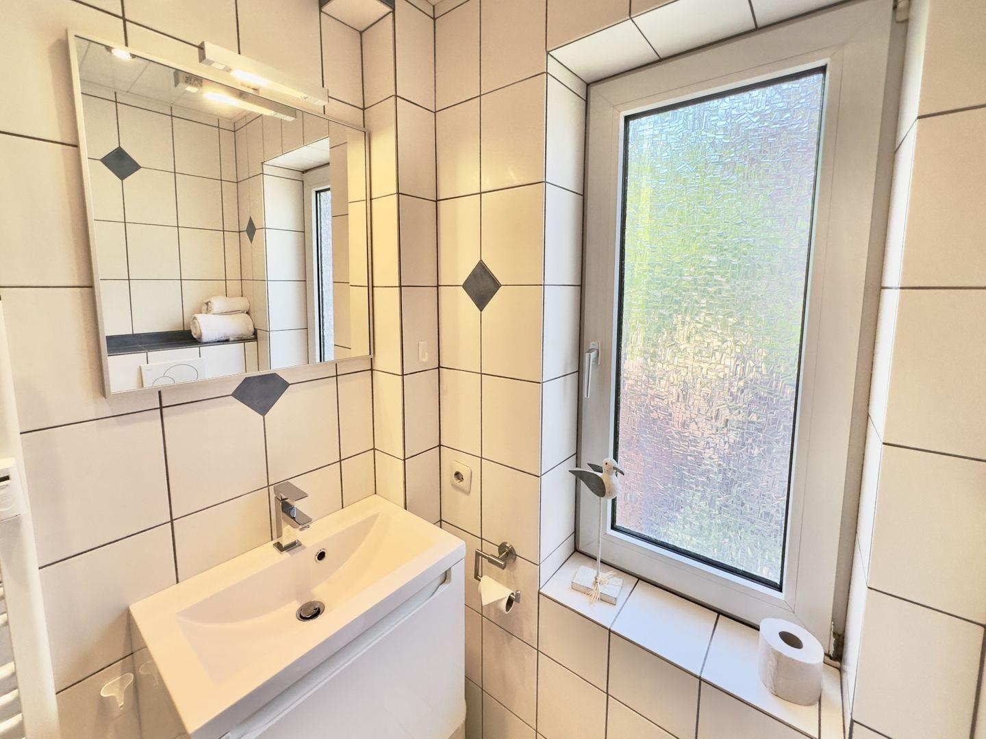 Das kleine Badezimmer im unteren Bereich der Wohnung ist freundlich und hell gefliest und bietet Ihnen alles, was Sie für Ihre tägliche Hygiene benötigen.