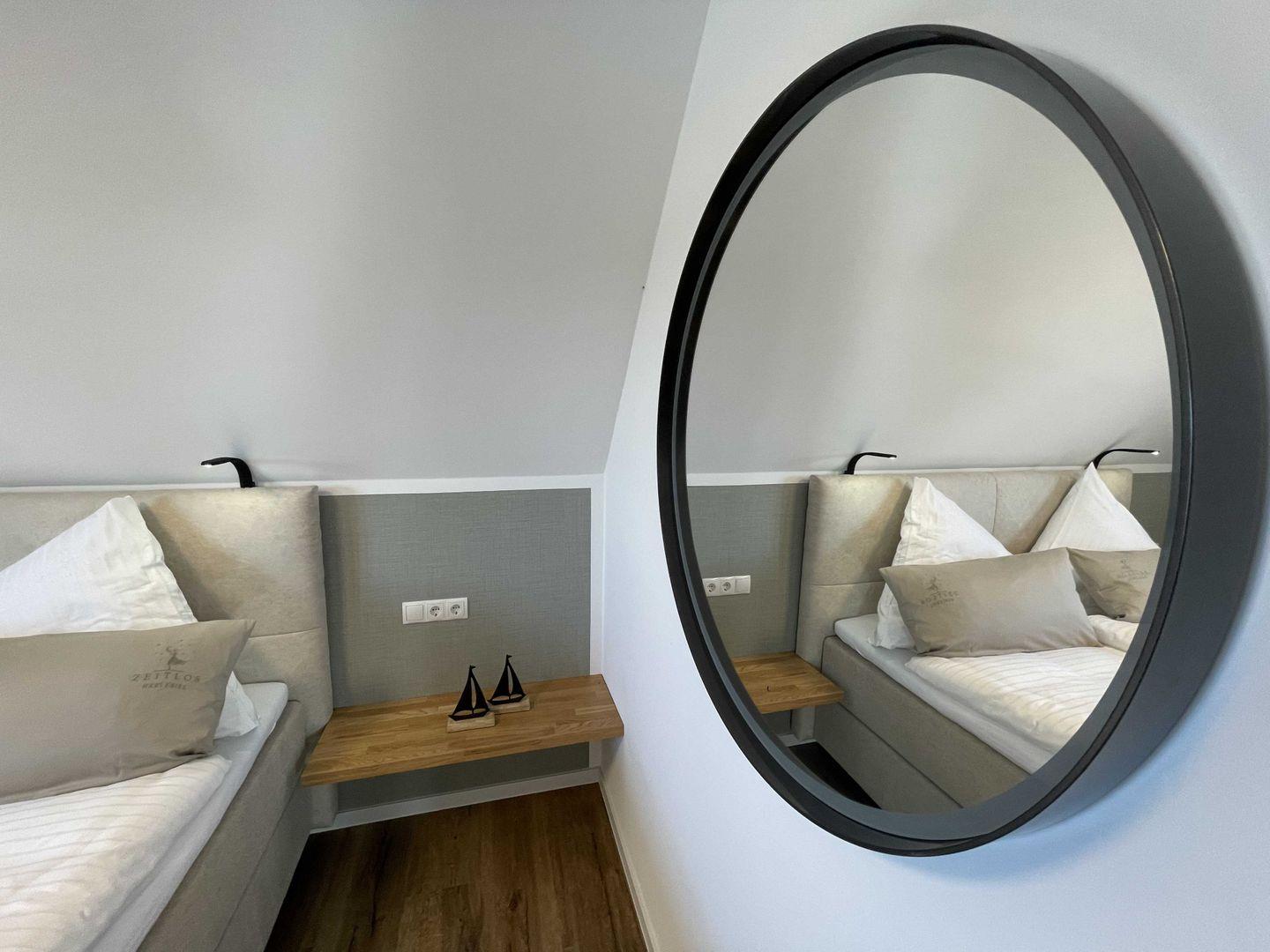- Ein Schlafzimmer im Erdgeschoss mit Boxspringbett, das bei Bedarf zu einem Pflegebett mit entsprechenden Funktionen umgebaut werden kann