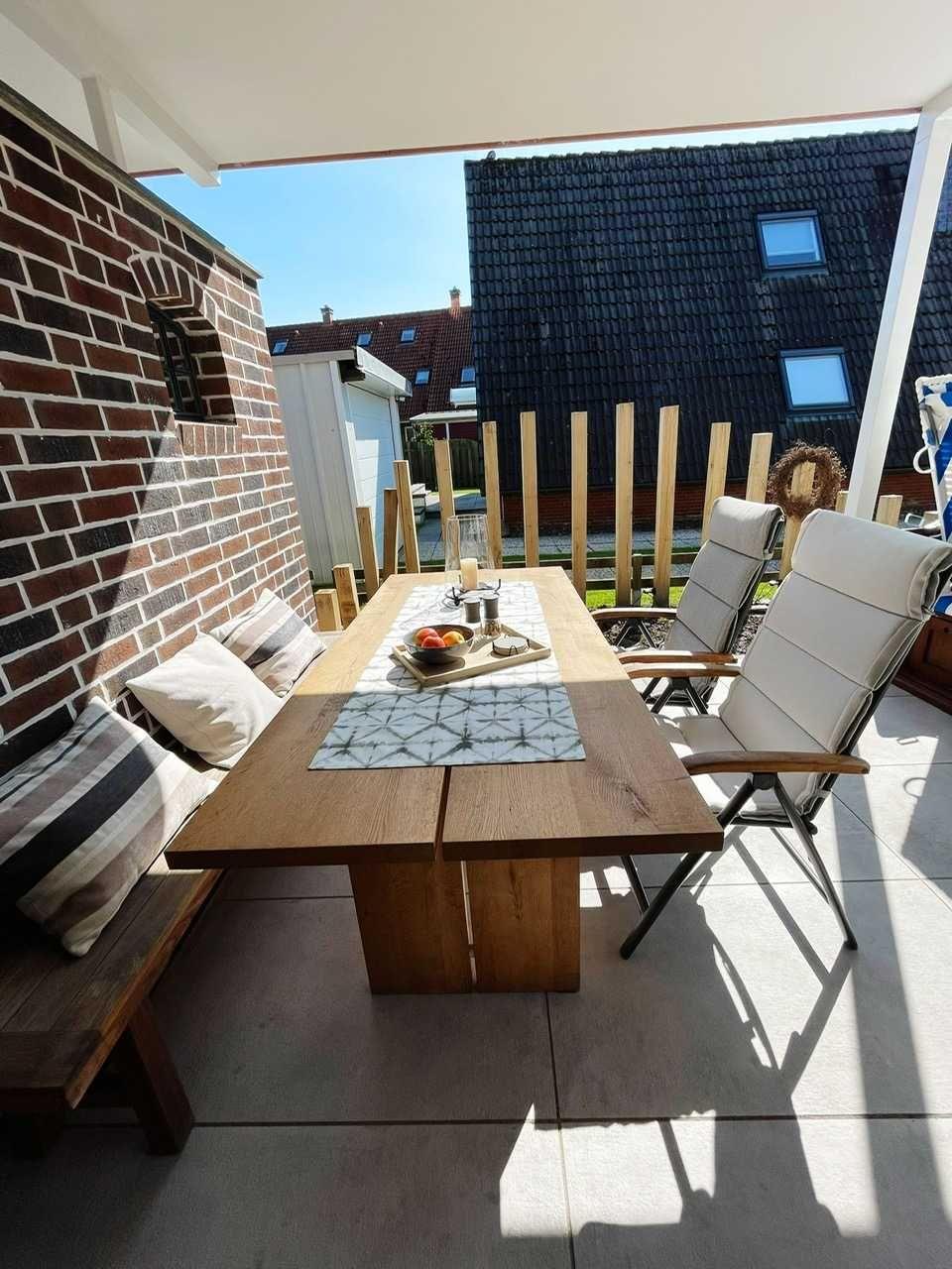 Der friesische Garten ist mit einer überdachten Terrasse, einer Sitzgruppe und einem Standkorb ausgestattet und lädt ein, an der frischen Nordseeluft zu verweilen und die Seele baumeln zu lassen. Die mitgebrachten Fahrräder können in einer abschließbaren Gartenlaube neben dem Haus untergebracht werden.