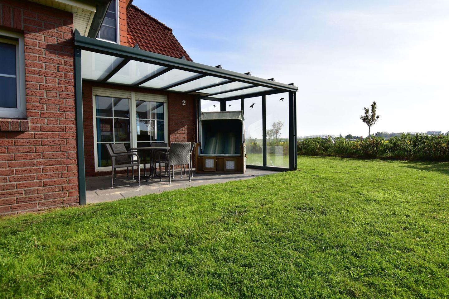 Der Garten des Hauses lädt zu entspannten Stunden im Freien ein: Auf der möblierten Terrasse, die teilweise wie ein Wintergarten überdacht ist, können Sie den Tag im Strandkorb ausklingen lassen. Der Garten wird gemeinschaftlich mit der angrenzenden Doppelhaushälfte genutzt, bietet aber dennoch genügend Raum zum Wohlfühlen.
