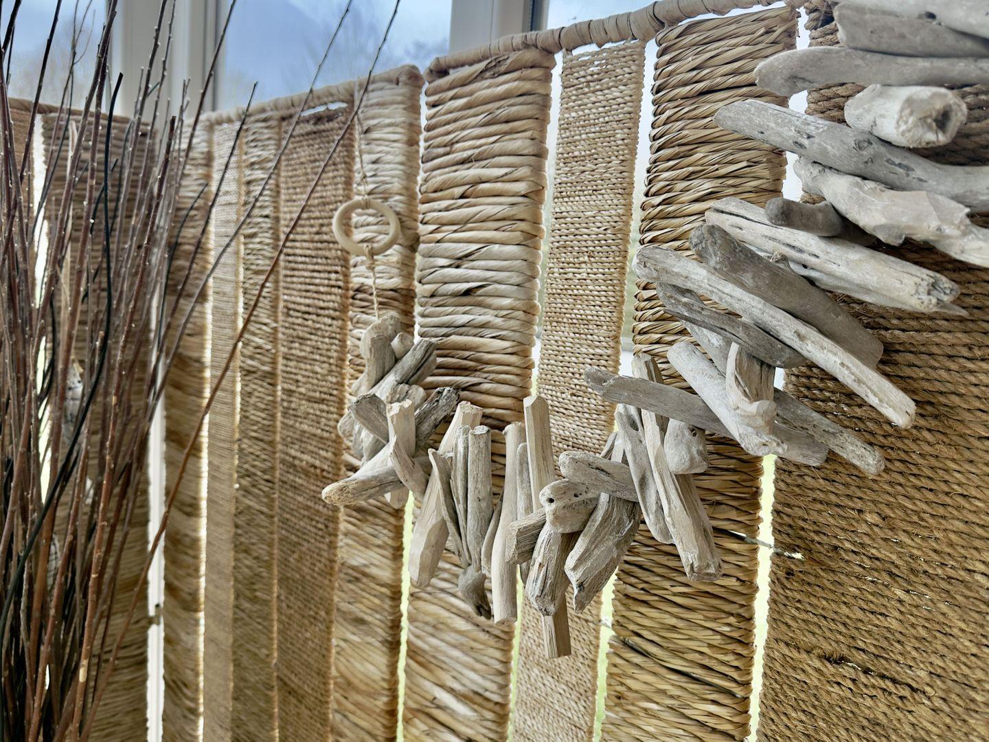 Das gemütliche Sofa in Erdtönen und zwei Rattansessel laden dazu ein, die Seele baumeln zu lassen – ob beim Lesen, Fernsehen oder beim Lauschen des knisternden Kamins an stürmischen Tagen.
