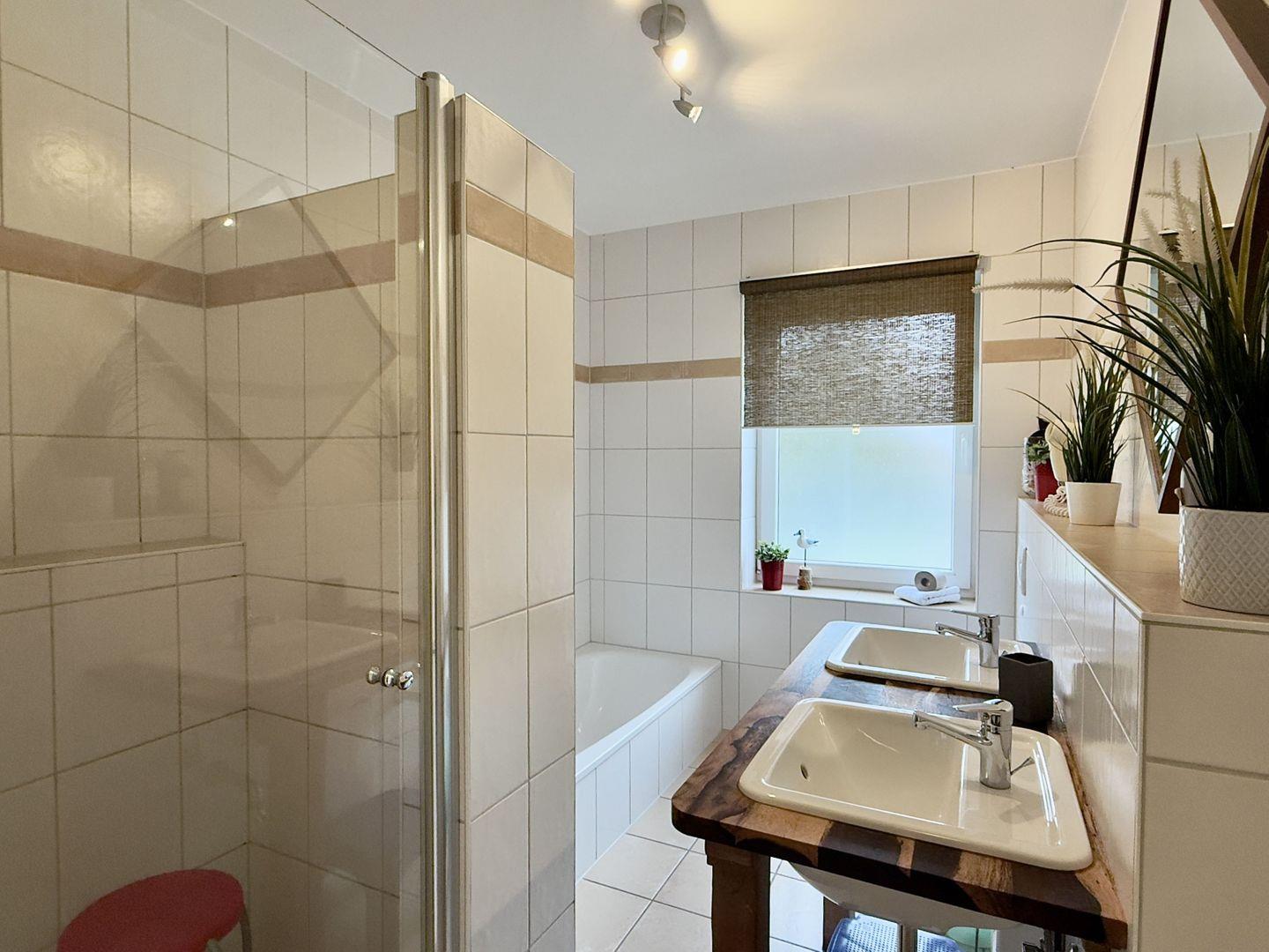 Das helle Badezimmer in harmonischen Erdtönen verwöhnt Sie mit Badewanne und Dusche – ideal, um erfrischt in den Tag zu starten oder entspannt ausklingen zu lassen.