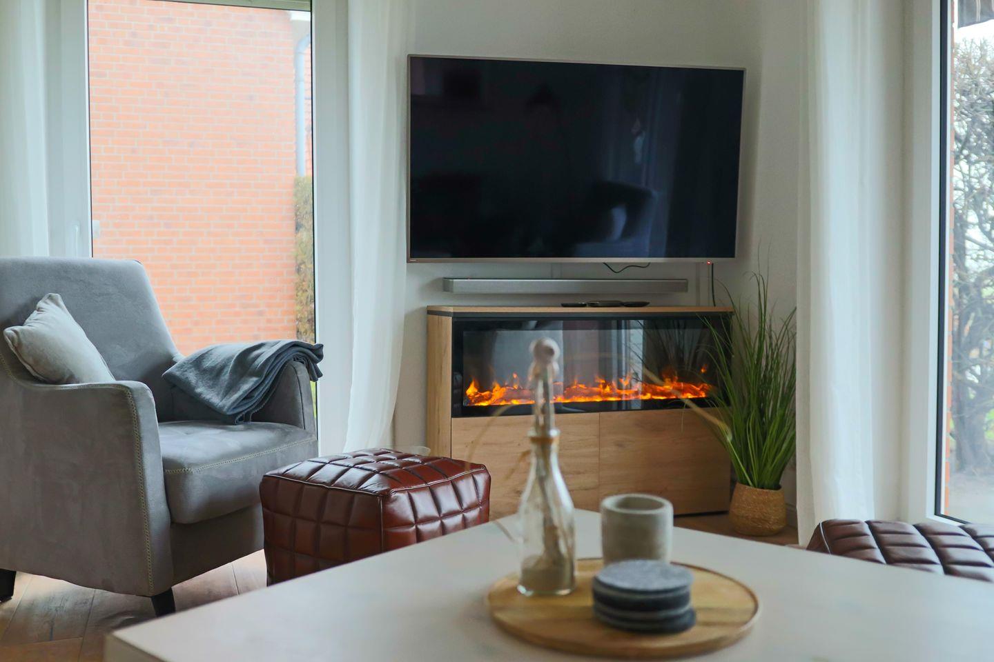 Das Ferienhaus bietet Platz für bis zu 6 Personen und verfügt über drei gemütliche Schlafzimmer – perfekt für Familien oder einen Urlaub mit Freunden. Der helle Wohnbereich lädt zum Verweilen ein, und der stilvolle Elektrokamin sorgt besonders an kühleren Abenden für eine behagliche Atmosphäre und entspannte Stunden.
