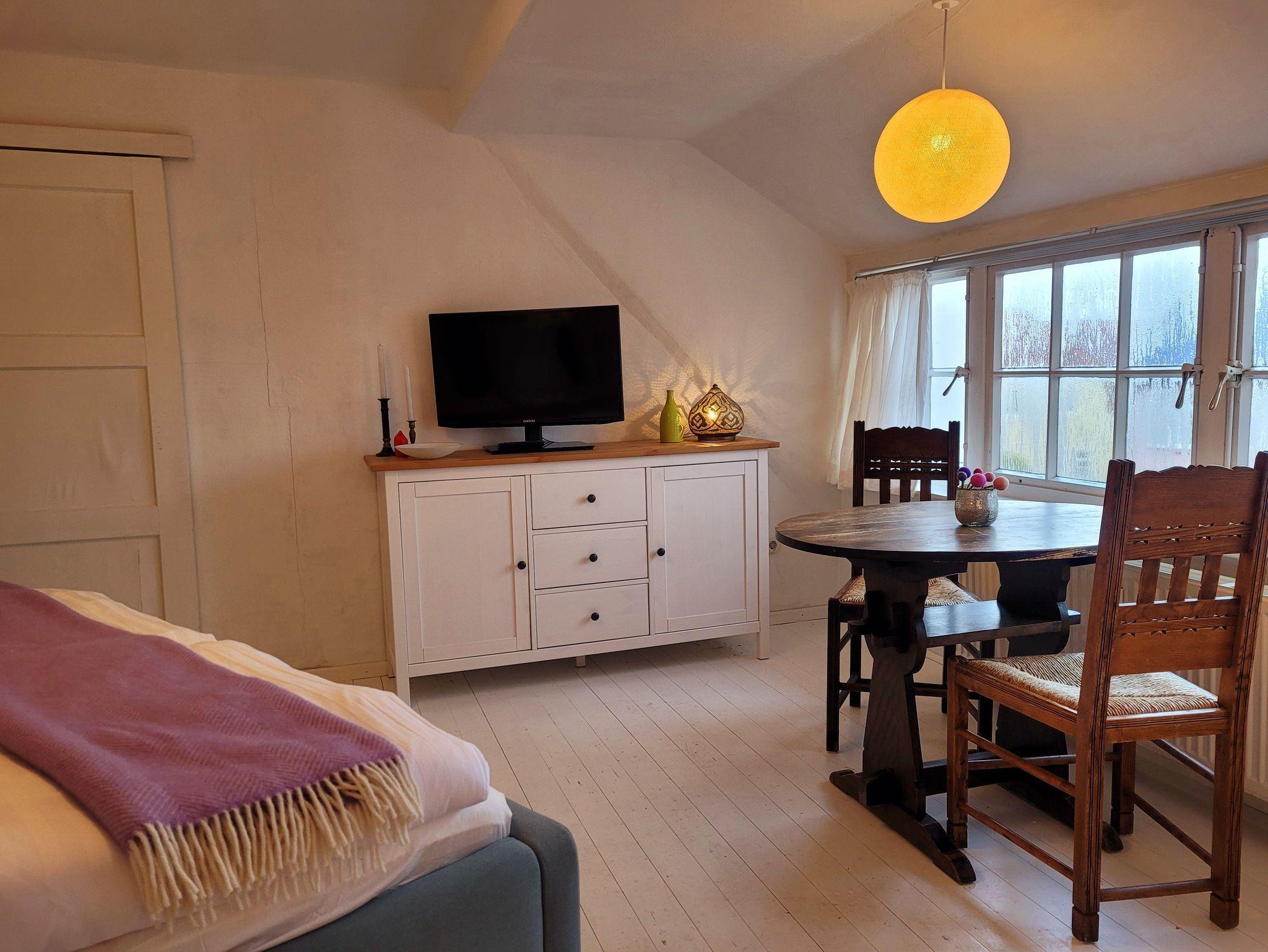 Die kleine, lichtdurchflutete Fwo befindet sich im ehemaligen Atelierhaus der Wencke-Schwestern im Herzen Worpswedes. Der windgeschützte Balkon lädt zum Energietanken ein. Mit Blick über die Dächer der Bergstraße lässt sich der Tag entspannt im Wohnbereich ausklingen.