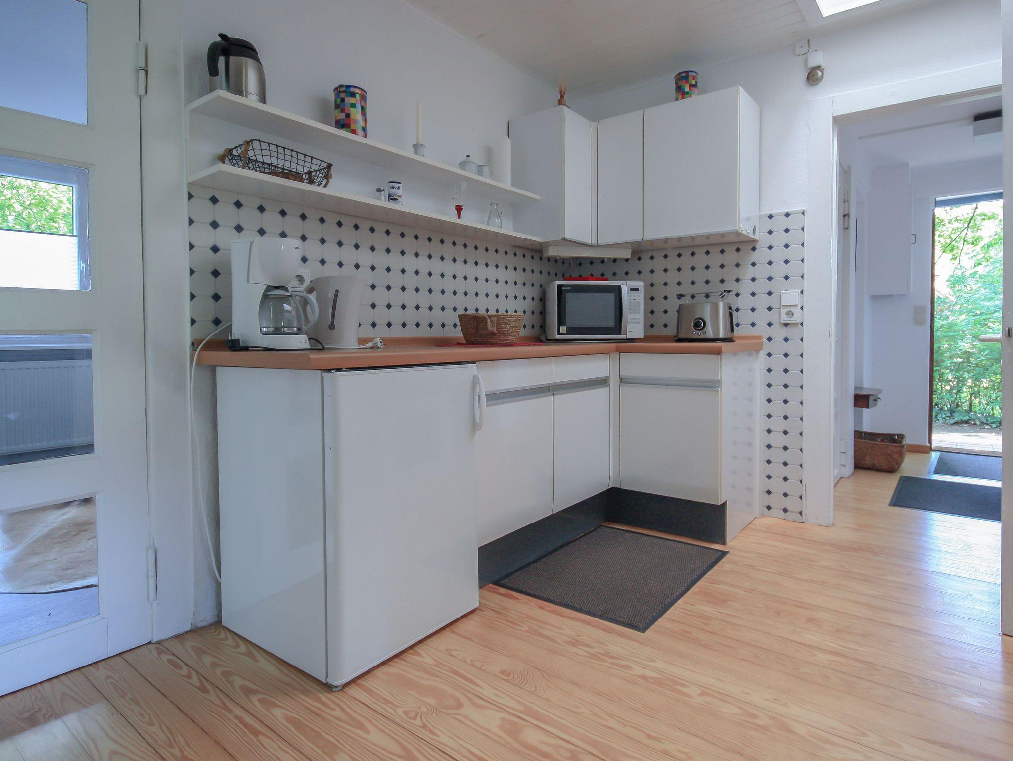 Durch eine weitere Tür gelangen Sie in die Küche, welche über eine Kaffeemaschine, eine Mikrowelle, einen Toaster sowie einem Kochfeld verfügt. Der anliegende Wohn- und Essbereich ist gemütlich gestaltet und gewährt einen herrlichen Ausblick auf die Marcusheide.