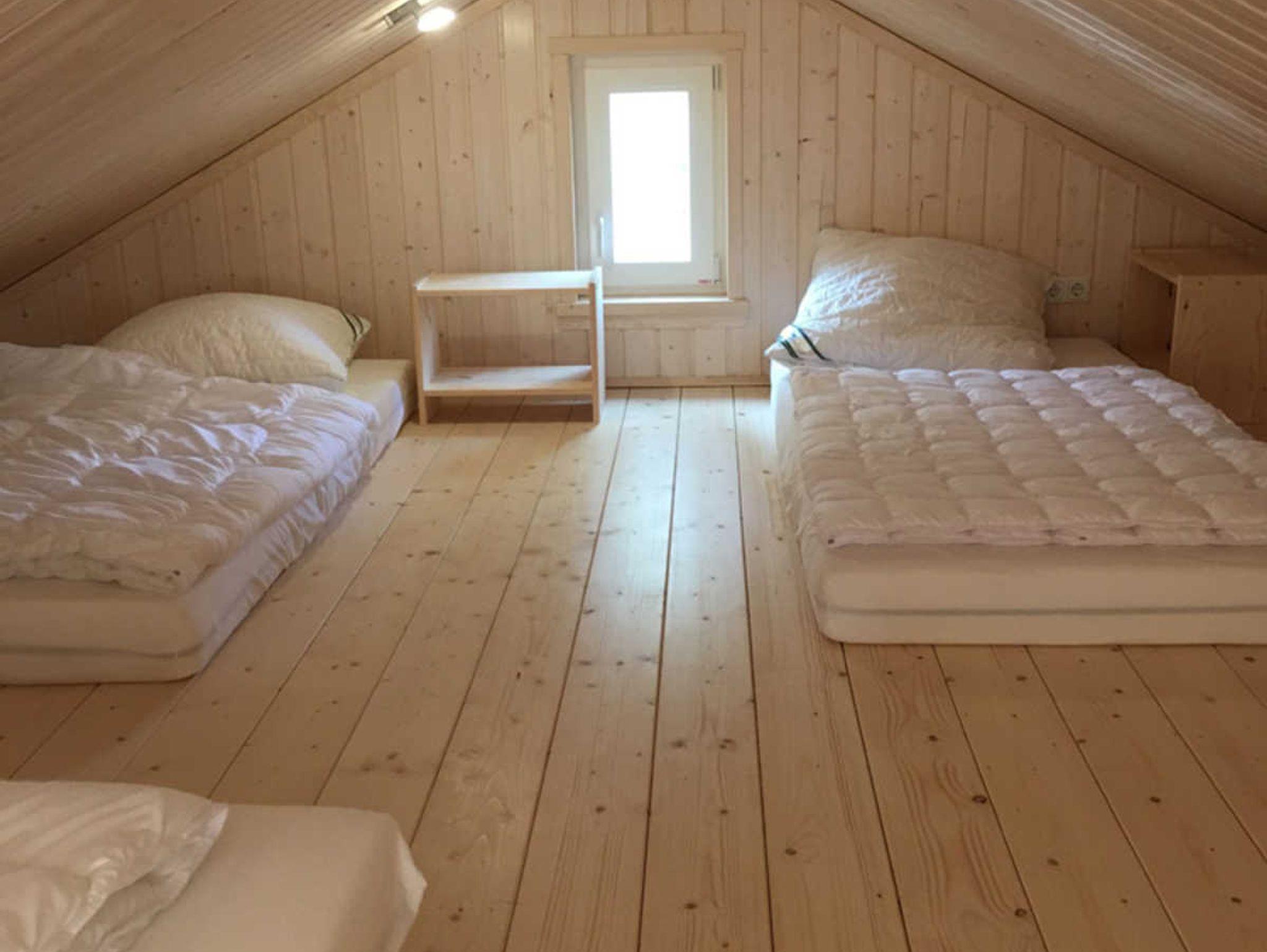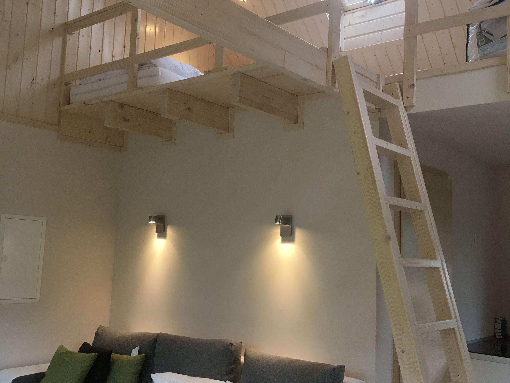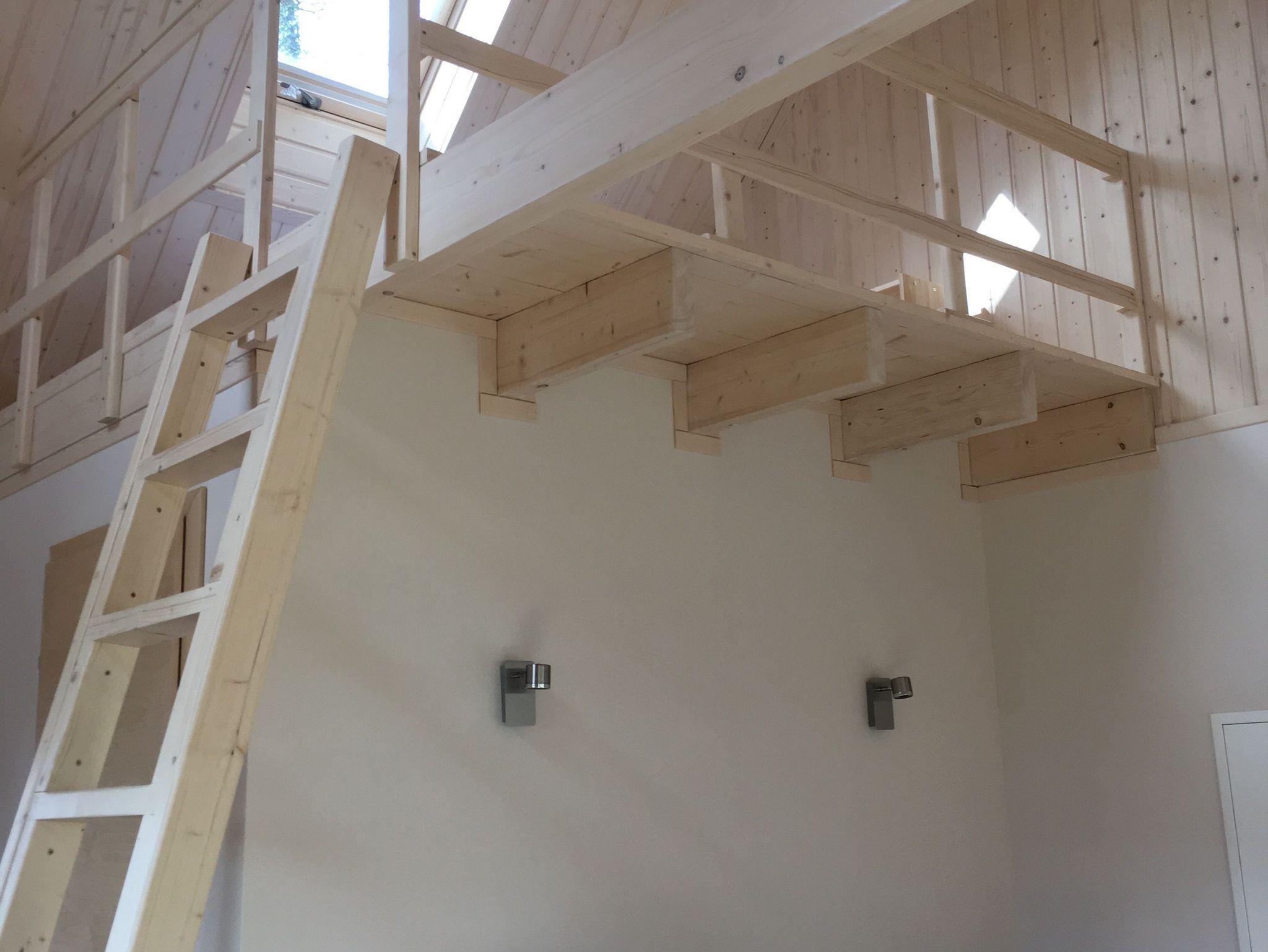 Das große Doppelbett befindet sich im Schlafzimmer, drei weitere gute Matratzen befinden sich auf dem Schlafboden, der über eine breite Leiter bequem zu erreichen ist.