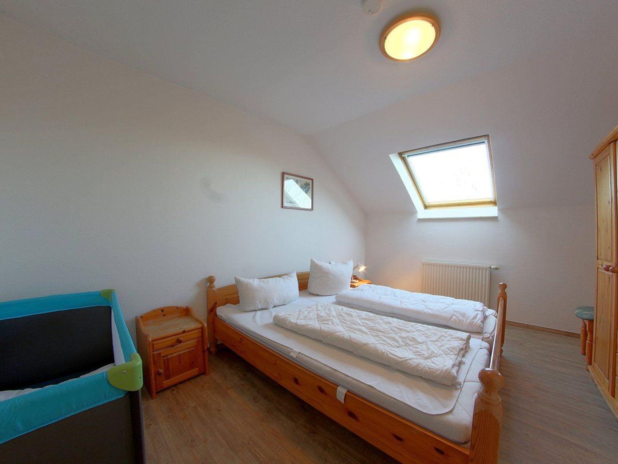 • Ein Schlafzimmer mit Doppelbett, ein weiterer offener Schlafbereich mit zwei Einzelbetten. Zusätzlich könnte eine fünfte Person auf der Schlafcouch im Wohnzimmer schlafen.