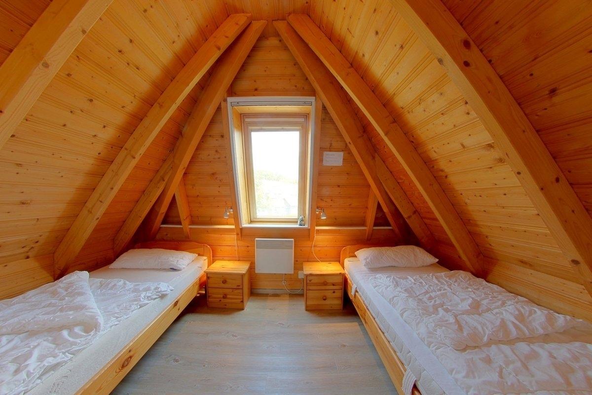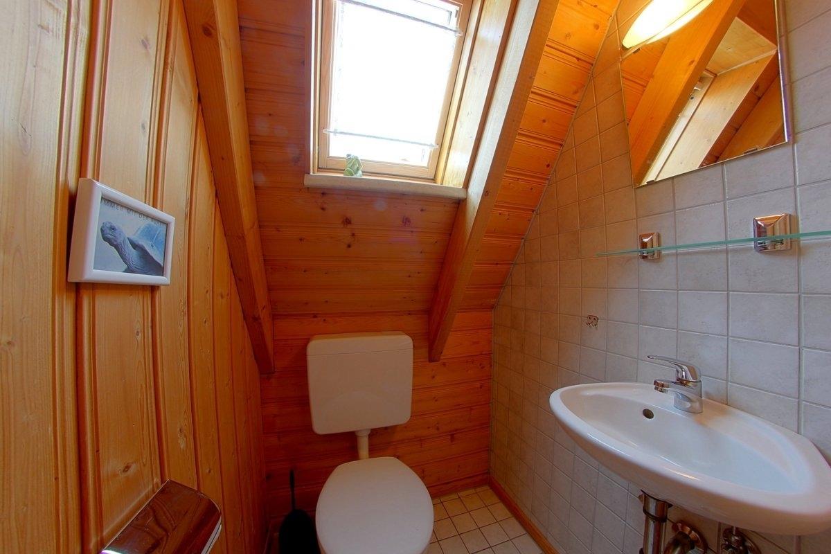 Im Obergeschoss befinden sich ein Schlafzimmer mit Doppelbett, TV und Babygitterbett, sowie ein Schlafzimmer mit zwei Einzelbetten. Für die Lütten stehen ein Babyreisebett und Hochstuhl kostenlos zur Verfügung. Ein separates WC gibt es ebenfalls im Obergeschoss.