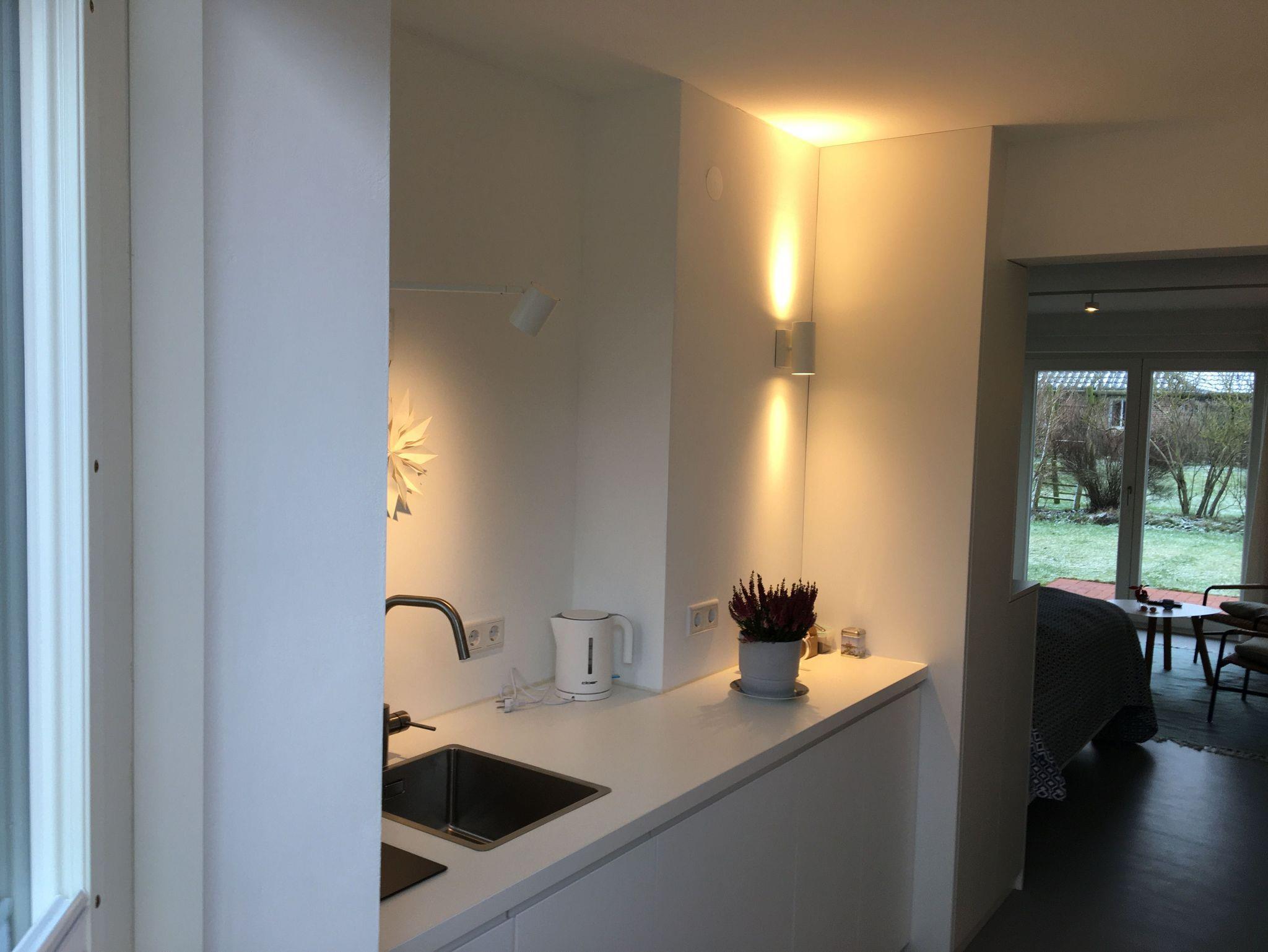 Ein eigener Eingang (Klöntür) und eine nach Osten ausgerichtete eigene Terrasse machen den besonderen Charme dieses Apartments aus. Es verfügt über eine kleine Pantry mit einem 2- Felder Induktionskochfeld, einem Kühlschrank und einer Spüle. In den Küchenschränken befinden sich ausreichend Kochutensilien und Geschirr für zwei Personen.
